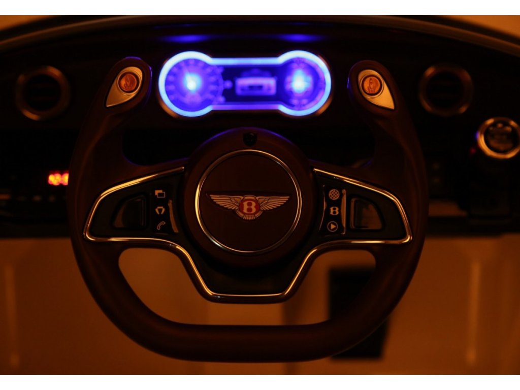 AUX bemenet (mp3 lejátszó, okostelefon csatlakoztatása), Gombok dallamokkal és kürt a kormányon, Töltésjelző - igen, indítás - Világító kapcsoló, Ajtónyitás - Igen (oldalsó nyitás) + ajtózár, Ülés mélysége 19 cm, - szélessége 34 cm, - Magassága 25 cm, -Bentley dombornyomású ökobőr borülés, - Többpontos biztonsági övek,Méretek A jármű méretei - Hossza 107 cm, - szélessége 59 cm, - Magassága 44 cm, A jármű tömege -14,5 kg, Kartondoboz mérete -109 x 57 x 28 cm, Karton súlya -16,5 kg, Maximum töltés -30 kg, engedély -7 cm,
