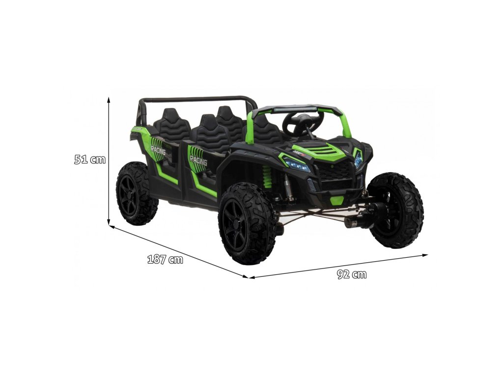 A négy nagy teljesítményű, 600 W összteljesítményű Buggy elektromos játékautó egyetlen gyerekgarázsból sem hiányozhat. A játékautó 24V 15,6Ah (LI-ion) kapacitású akkumulátorral működik. A kocsi maximális terhelhetősége 120 kg. Zenei panel MP3-mal, Bluetooth-al, USB-vel és előre felvett dallamok.