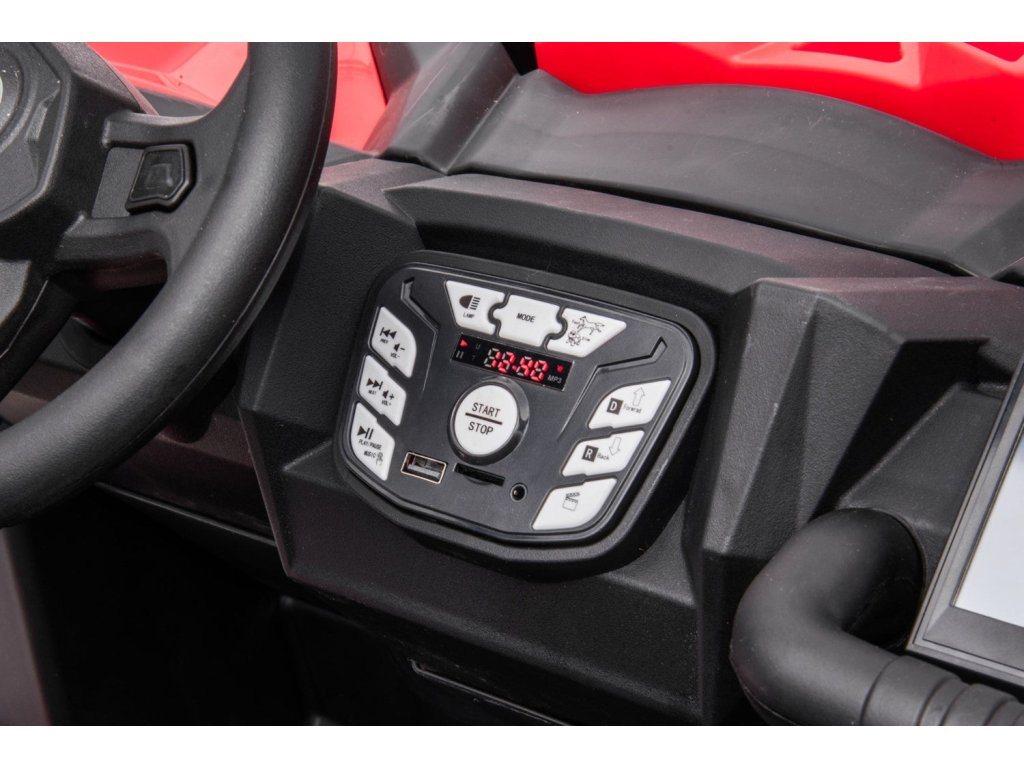 Az autót a 2,4 GHz-es frekvencián működő távirányítóval irányíthatod. A távirányító három sebességfokozattal és egy biztonsági STOP gombbal rendelkezik, amely megnyomására azonnal leállítja az autót. Az ülés kiváló minőségű műanyagból készült és kétpontos biztonsági övvel rendelkezik.