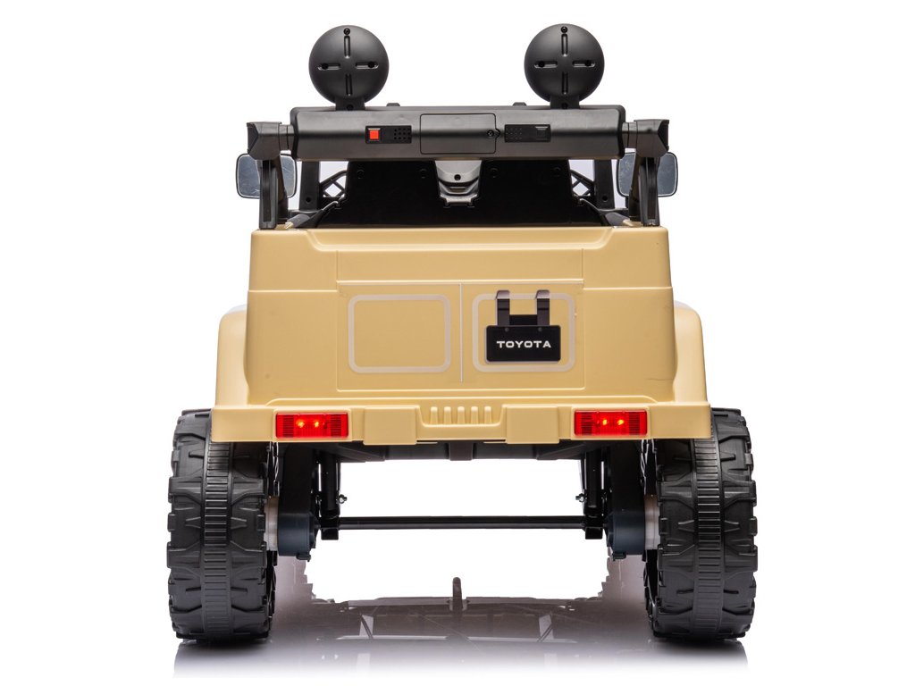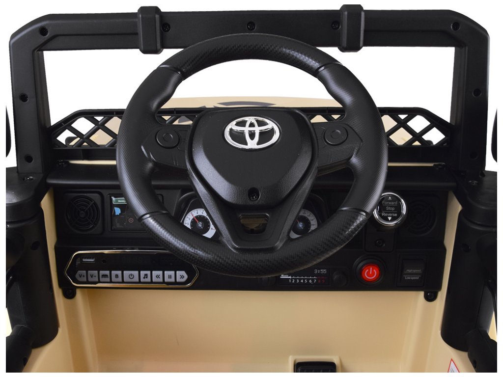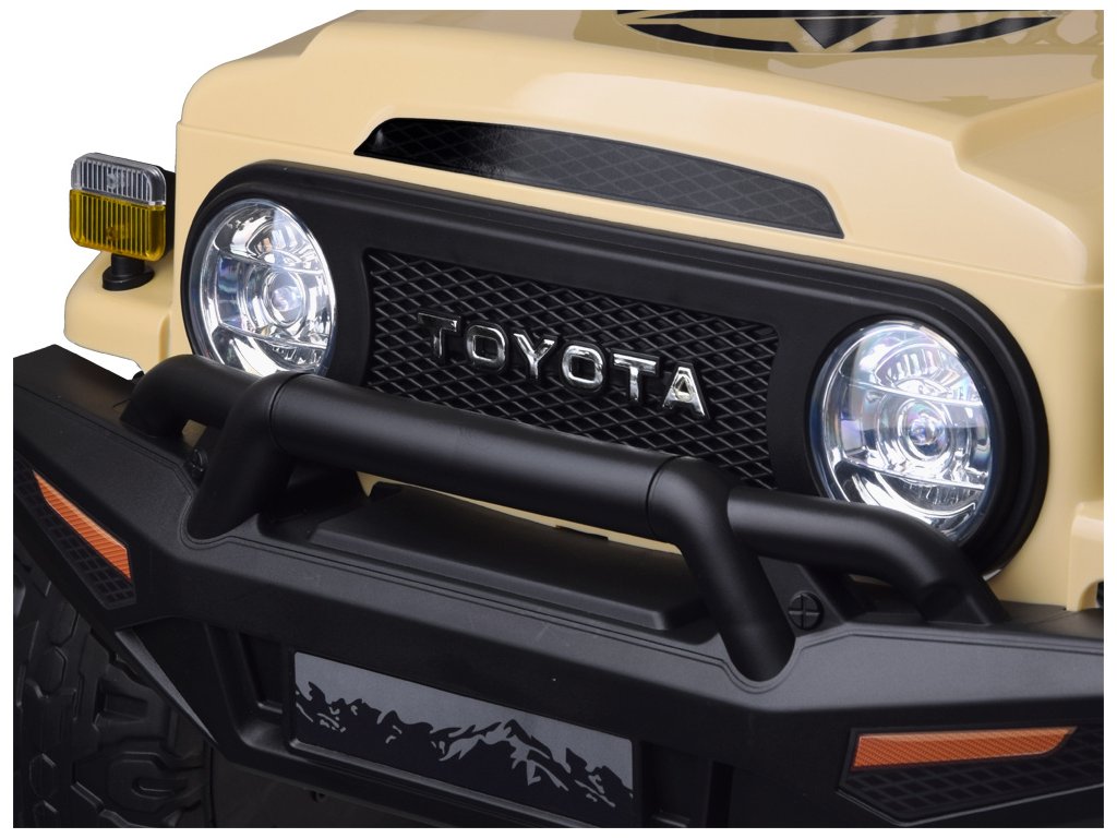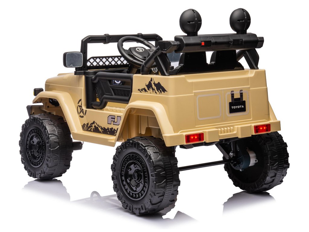 A Toyota FJ Cruiser elektromos autó két erős 12V 35W 12000RPM motorral (hátsó tengelyen) és két 12V 35W 6000RPM segédmotorral az első tengelyen található. A zenepanel bekapcsolása után hallani fogja a motor indításának hangját. Az FJ Cruiser zenei panellel van felszerelve, amely angol nyelvű dalokat és történeteket tartalmaz. Ezenkívül a panel rendelkezik USB és MP3 bemenetekkel, amelyeknek köszönhetően a fiatal vezető vezetés közben hallgathatja kedvenc dalait.