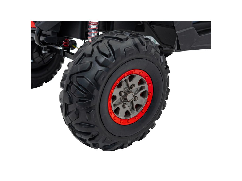 A Buggy UTV-MX 2000N gyerekjáték-autó puha EVA hab kerekeken érkezik, amelyek csendesek és alkalmazkodnak a különböző terepviszonyokhoz. A gyermek egy kényelmes, öko-bőrből készült ülésben ül, a biztonságát pedig biztonsági övek biztosítják.
