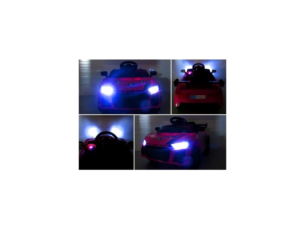 Cabrio A1 gyerekautó gazdag felszereltséggel és innovatív dizájnnal. A játékautó belseje biztonsági övvel ellátott üléssel, MP3 bemenettel rendelkező zenepanellel és dallamokkal ellátott gombokkal van felszerelve. Az első LED-lámpák megvilágítják az utat.