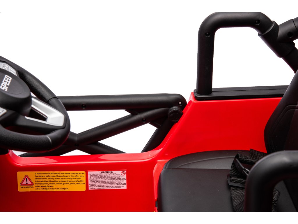 Az OFFROAD elektromos gyermekautó nagy kerekekkel rendelkezik, amelyek különböző terepviszonyokhoz igazodnak. A gyermek kényelmesen kialakított ülésben ül, biztonsági övvel rögzítve. A teherbírás akár 30 kg is lehet.