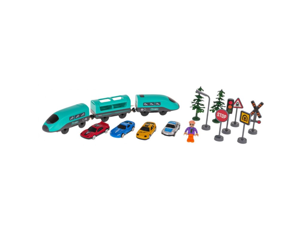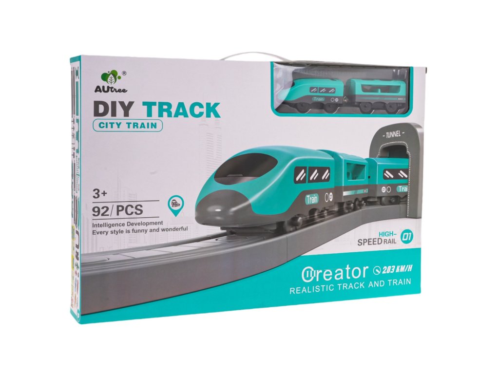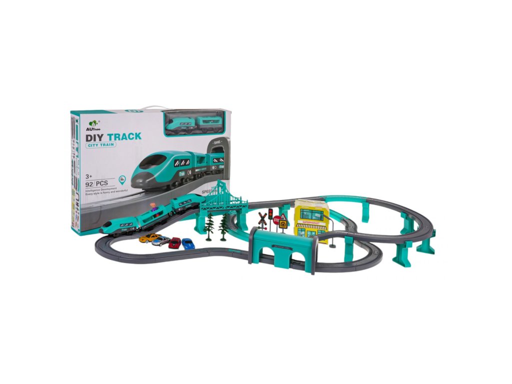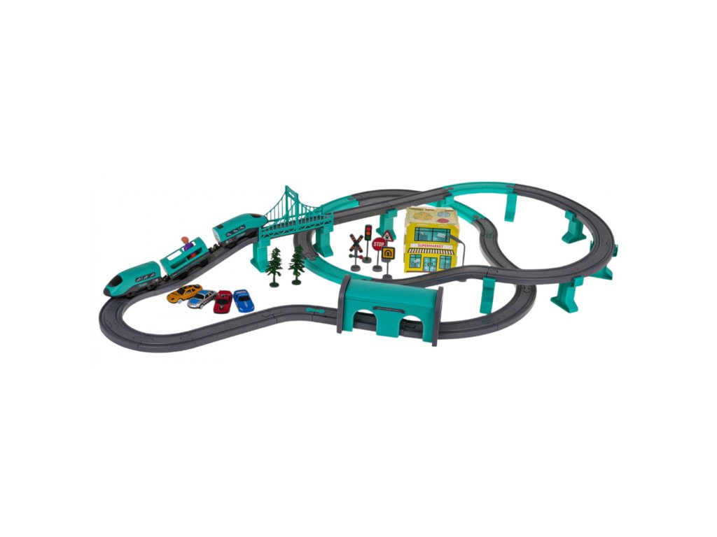 Jól felszerelt vasúti készlet vonattal és kiegészítőkkel 3 éves kortól gyerekeknek . A készlet a legjobb minőségű műanyagból készült, élénk színekkel, amelyek vonzzák a gyerekek tekintetét. A készlet 92 elemet tartalmaz: vágány építőelemei, vonat, állomás, híd, szupermarket, közlekedési táblák, valamint egy játékautó és egy figura.