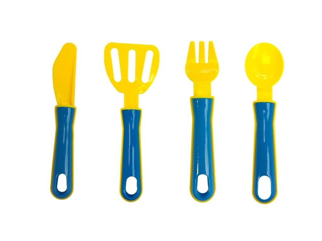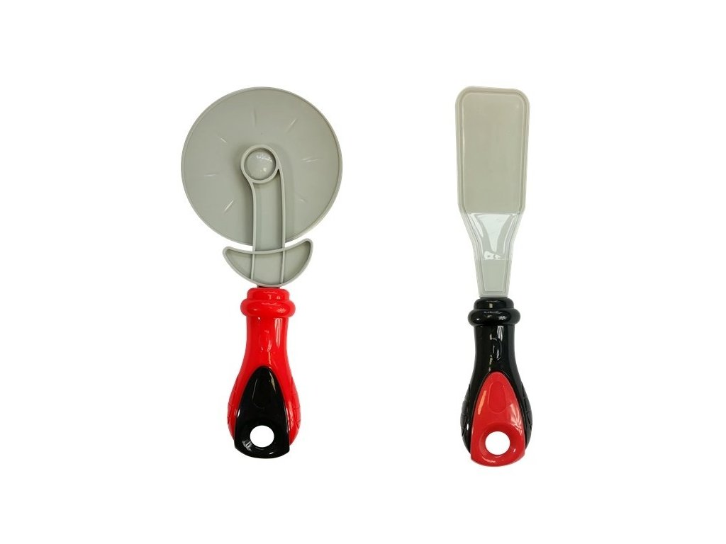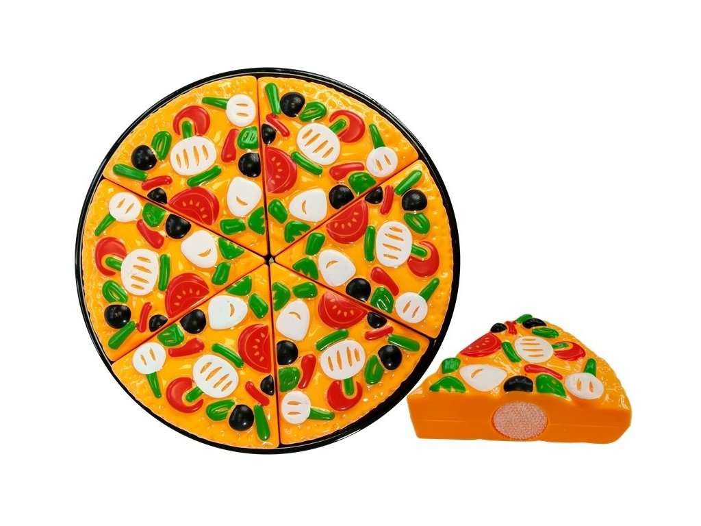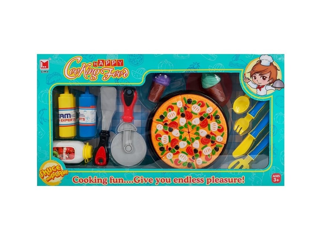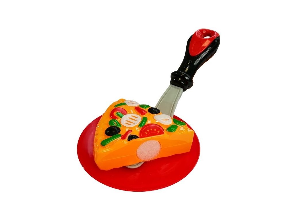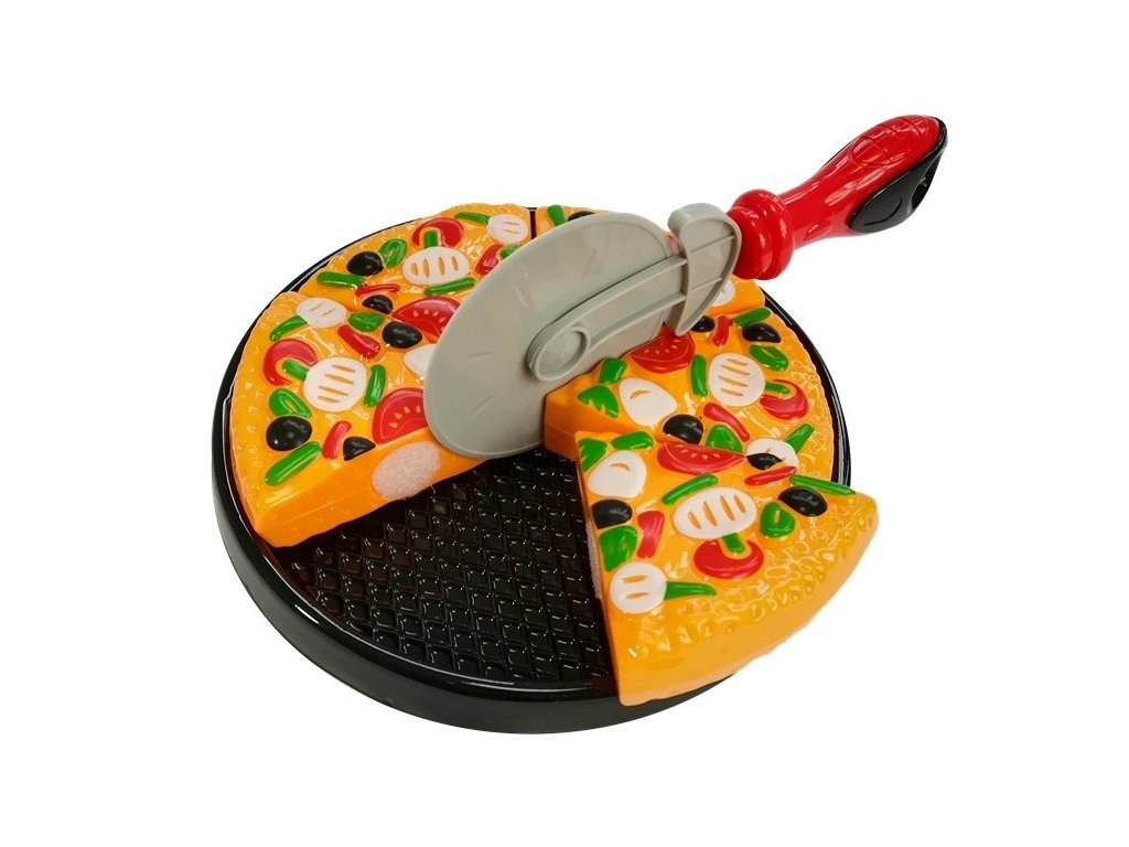 Ebben a készletben az ételdarabok tépőzárral vannak összekötve, ami szorosan összetartja őket, így a mellékelt késekkel vághatók. Ennek a megoldásnak köszönhetően gyermeke a pizzavágó segítségével tökéletesen egyenletes darabokra tudja vágni a pizzát.