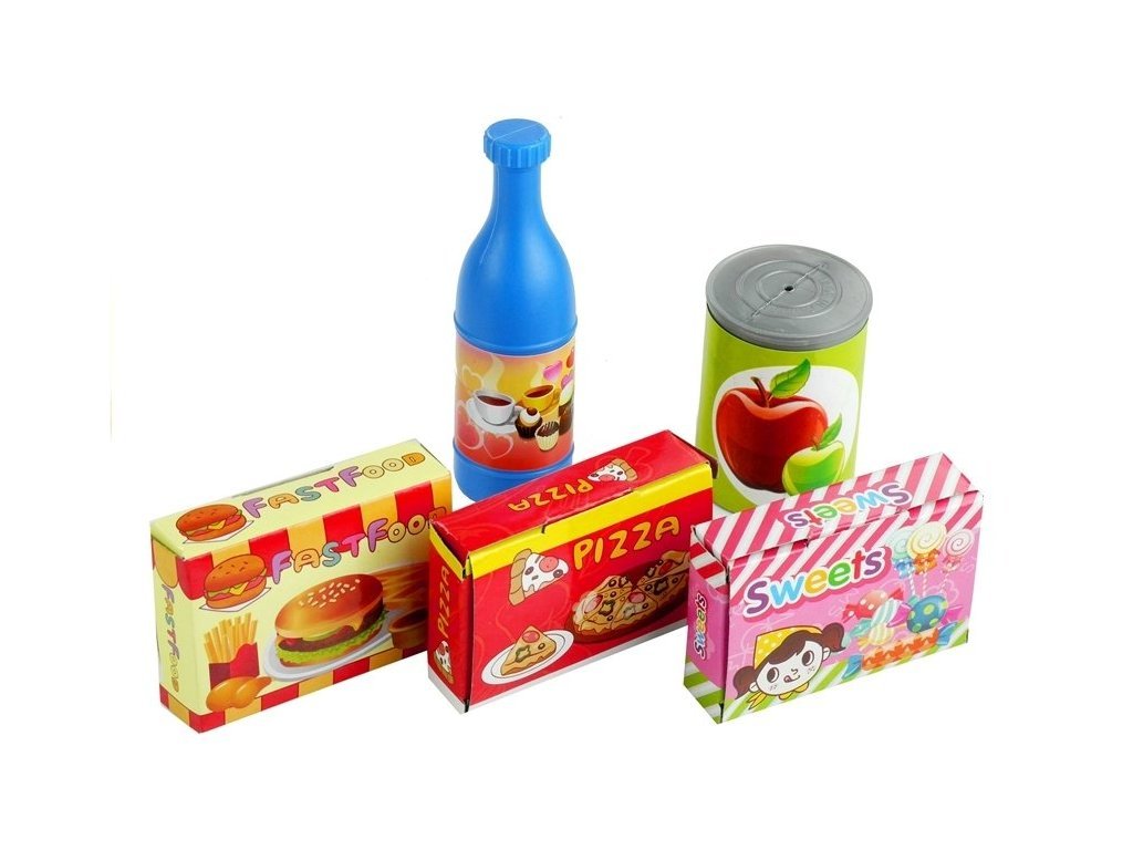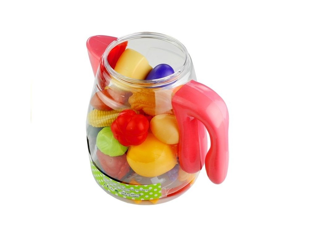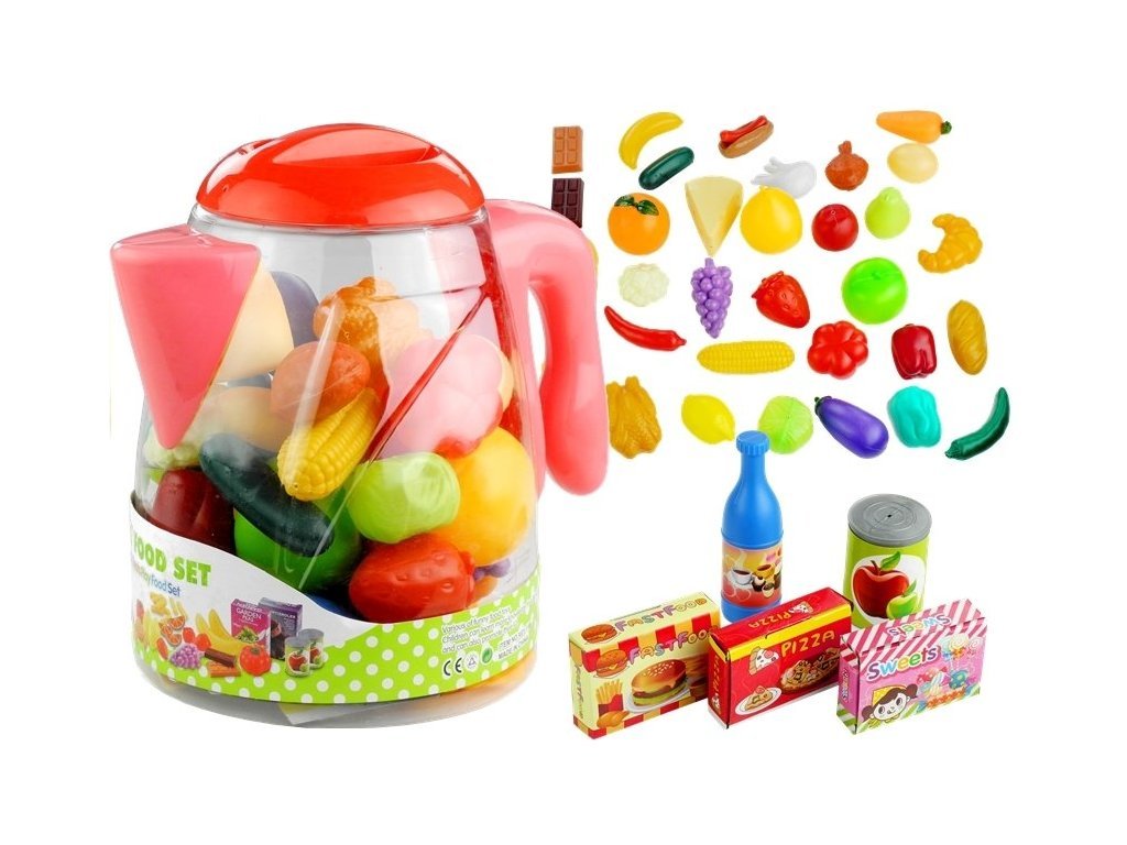 Egy nagy átlátszó kancsóban különféle ételek találhatók, amelyek minden játékot tökéletesen megfűszereznek. Ezzel az ételutánzattal a gyermek az élelmiszerboltban játszhat és finom ételeket készíthet. Minden elem a gyermekek számára bevált műanyagból készült. A játék CE tanúsítvánnyal rendelkezik , és 3 éves kortól gyermekek számára készült.
