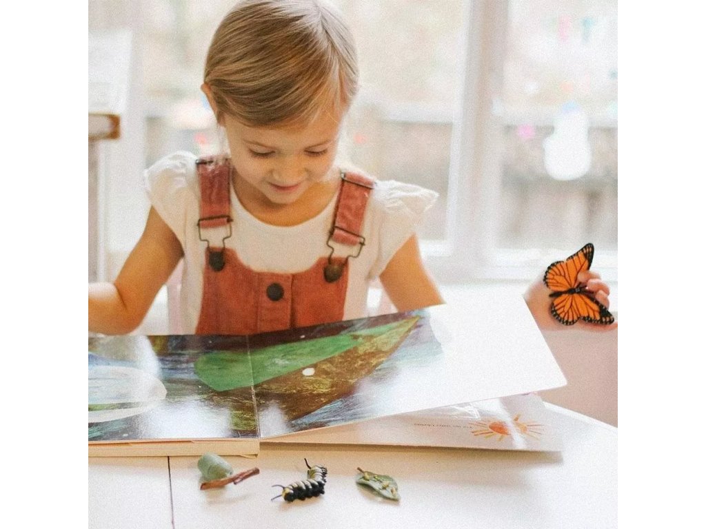 A négy modellből álló készlet a monarcha pillangó fejlődésének főbb szakaszait mutatja be a petéktől a kifejlett egyedig. A modellek megközelítik a peték, a hernyó, a báb és a kifejlett egyed formáit, színeit és méretarányait, és ösztönzik a megismerés iránti érdeklődést és a szórakoztató tanulást.