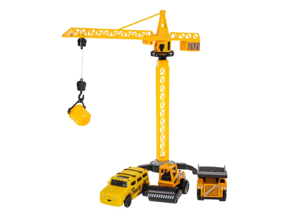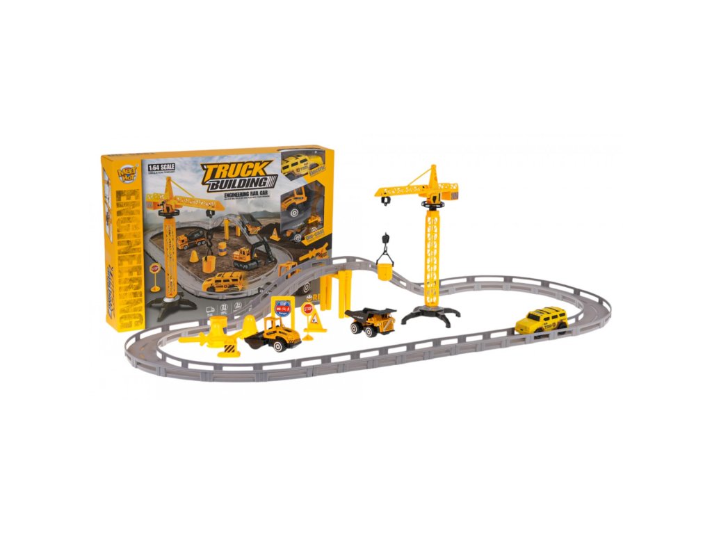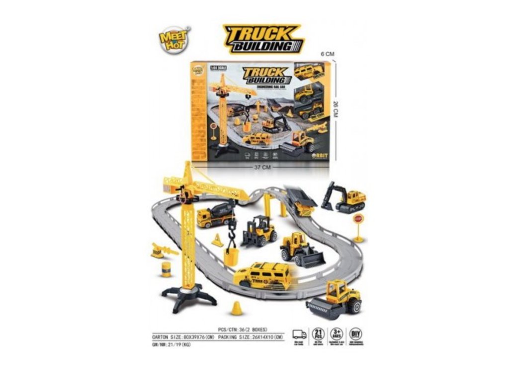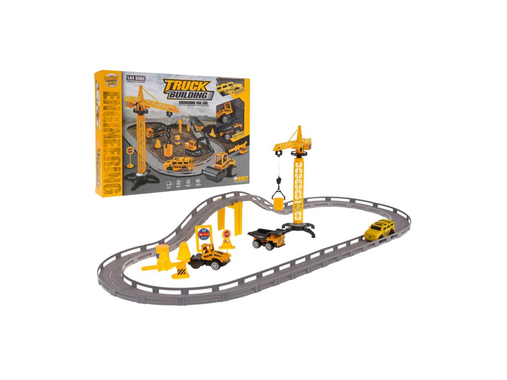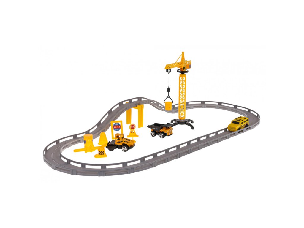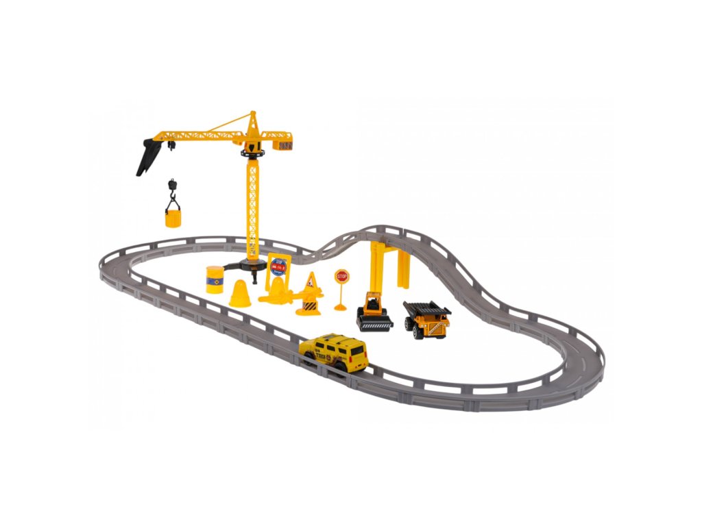 Jól felszerelt autópálya építőautóval és daruval 3 éves kortól gyerekeknek. A készlet 21 külön összeszerelt alkatrészből áll. A legjobb minőségű műanyagból készült. Az autópálya korlátokkal van felszerelve, amelyek megvédik az autókat a leeséstől. A daru mozgatható elemekkel rendelkezik, mint például egy 360 fokban forgó kar és egy süllyesztőhorog (kézi hajtókar). A készlet 3 építőipari autót tartalmaz, mint egy billenőkocsi, egy henger és egy elektromos autó. A billenőkocsi és a henger fém testtel és mozgó alkatrészekkel rendelkezik. A görgőnek mozgatható és forgó dobja, a billenőnek pedig emelő-leeresztő pótkocsija van.