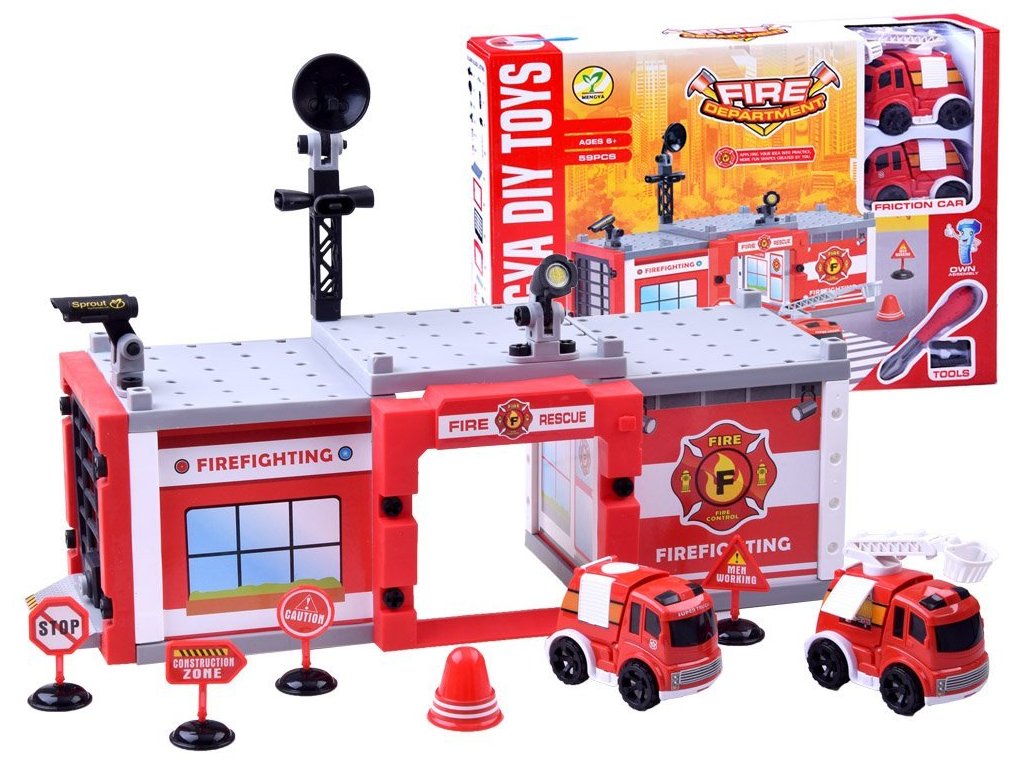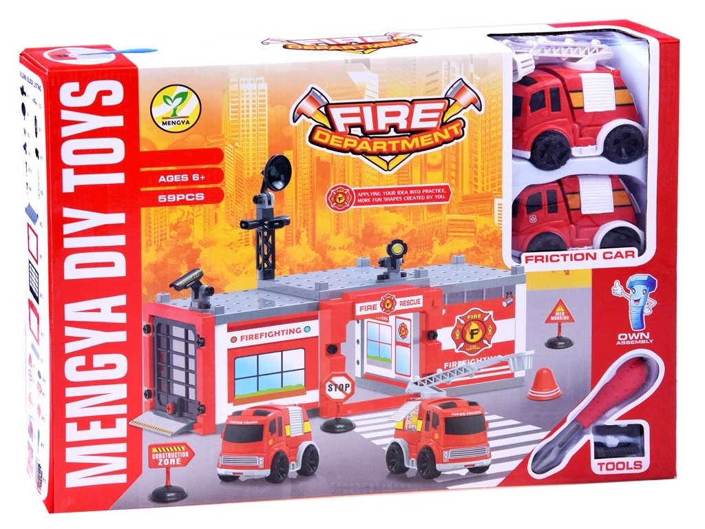 Kreatív építőelem készlet 3 éves kortól gyerekeknek. Ez a készlet 59 darabot tartalmaz egy tűzoltószertár építéséhez.