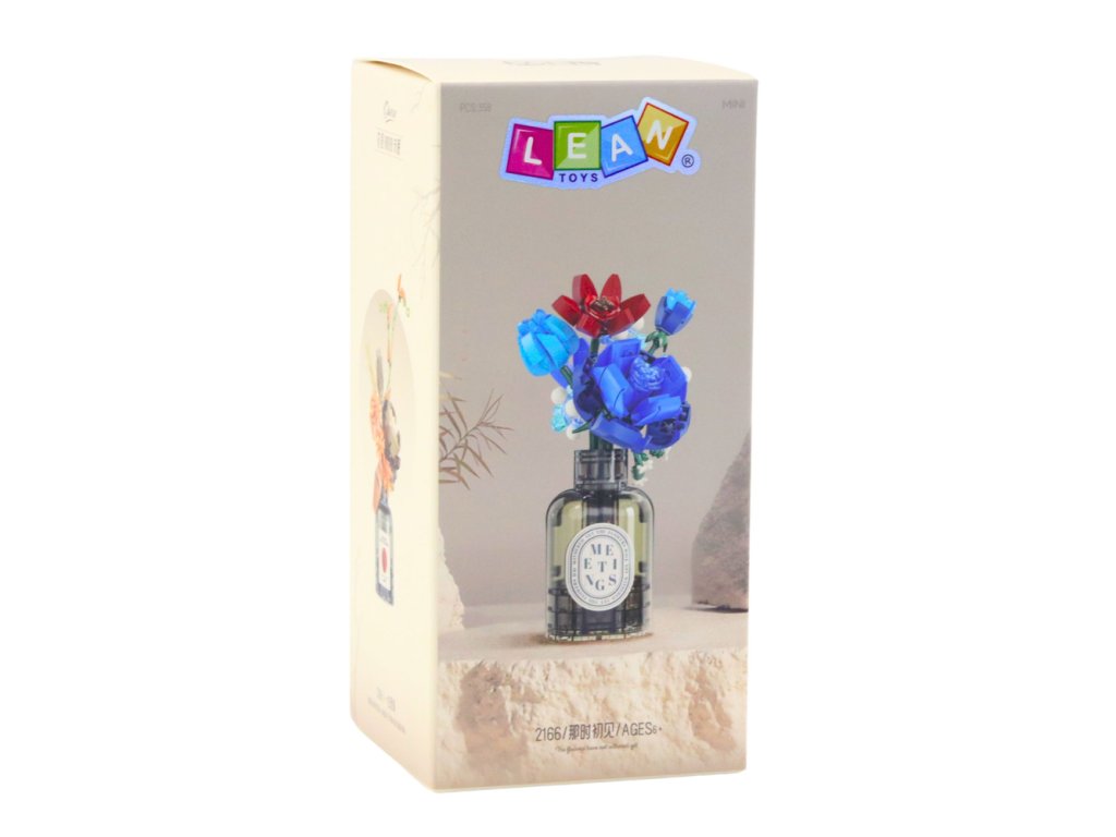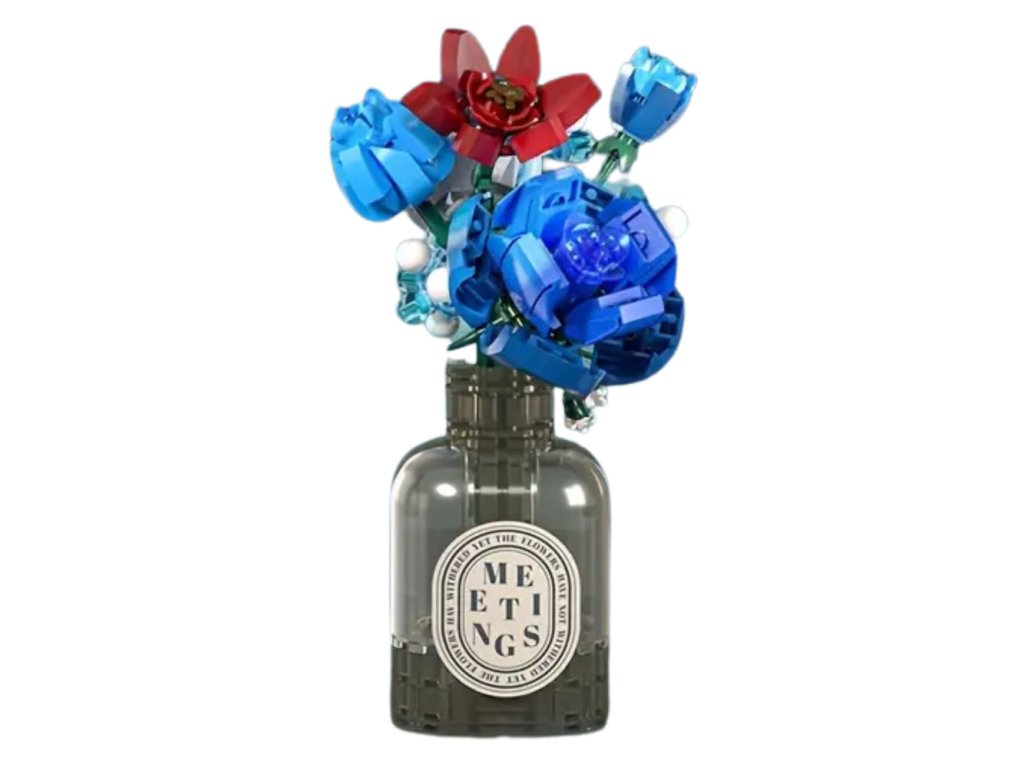 Készítsen eredeti dekorációt egyedi építőkészlettel, amely ötvözi a kreatív szórakozást az eleganciával. Ez a sötét üvegben lévő csokor felhívja a figyelmet a kék és piros kontrasztos színeivel, a virágok finom részleteivel és a modern dizájnnal. A kész kompozíció friss és stílusos hatást kelt, ami vonzó kiegészítővé teszi a polcon, asztalon vagy komódon. Nagyszerűen szolgál eredeti ajándékként minden virág- és építőkocka-rajongó számára.