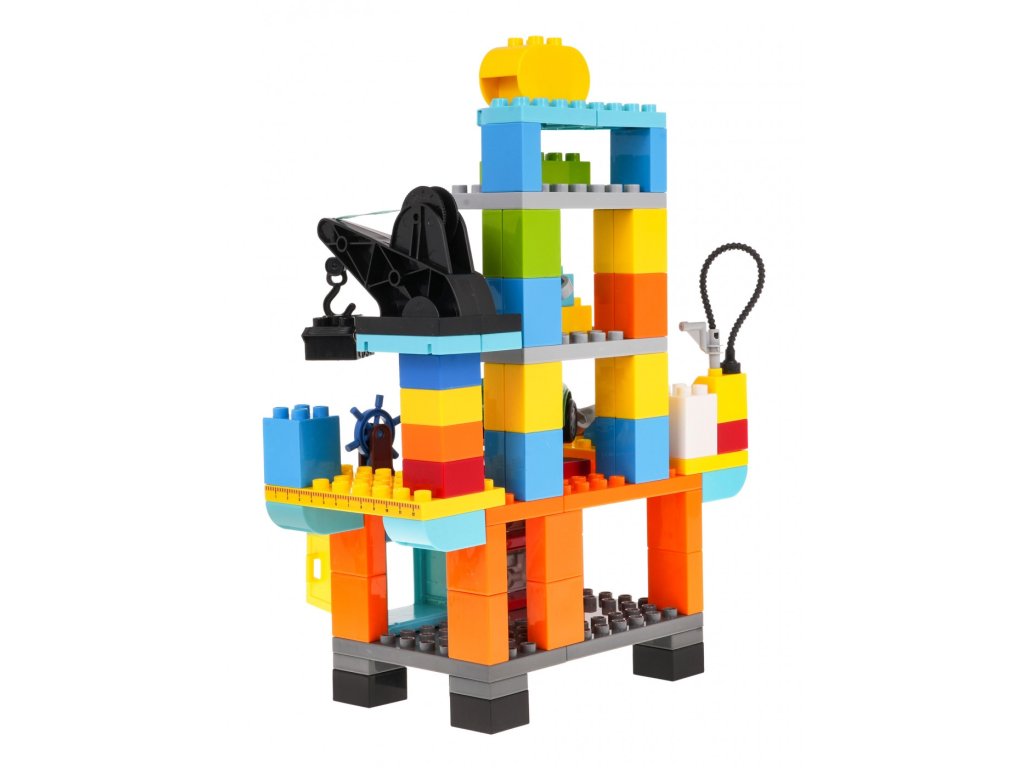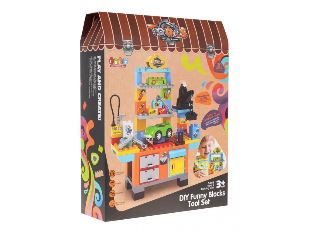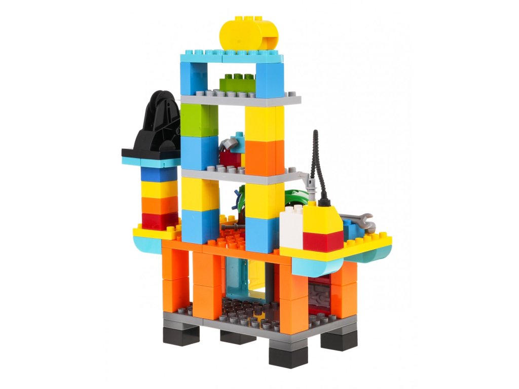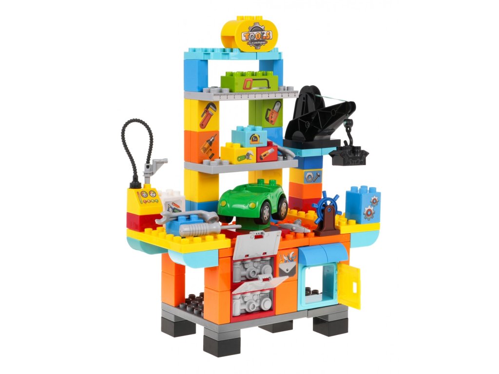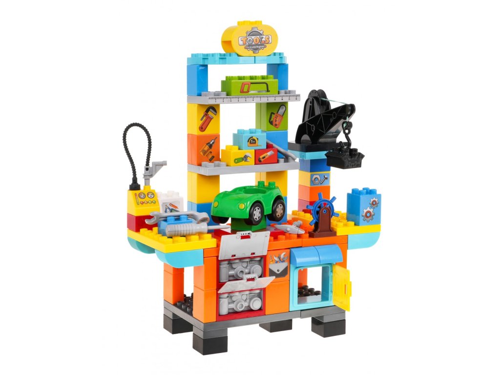 Építőelemek 3 éves kortól gyermekeknek szóló műhely építéséhez. A kockák a legkiválóbb minőségű anyagokból készültek, biztonságosak a gyermek számára. A műhely egy játékautóval, szerszámokkal - csavarhúzóval, villáskulccsal, emelővel és egy pisztollyal ellátott géppel is fel van szerelve, amely a kerekekbe pumpálja a levegőt. A teljes készlet 92 darabból áll.