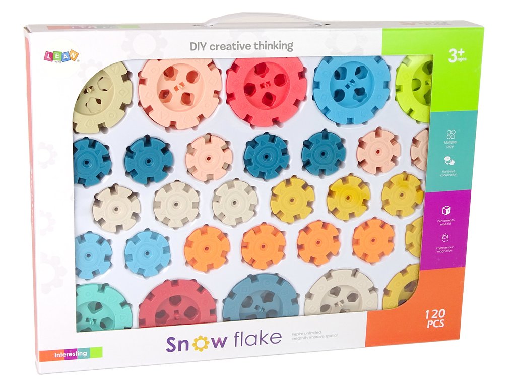 A teljes készlet 120 darabot tartalmaz, a hópelyhek különböző színben és méretben kaphatók. A szerkezetek építése és tervezése érdekli a kisgyermeket, és lehetővé teszi számára, hogy kreatívan töltse szabadidejét. Belül egy szórólap található példákkal arra vonatkozóan, hogy milyen struktúrákat lehet létrehozni.