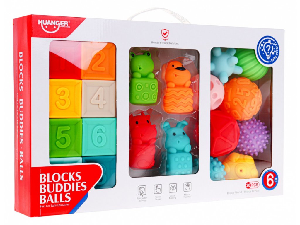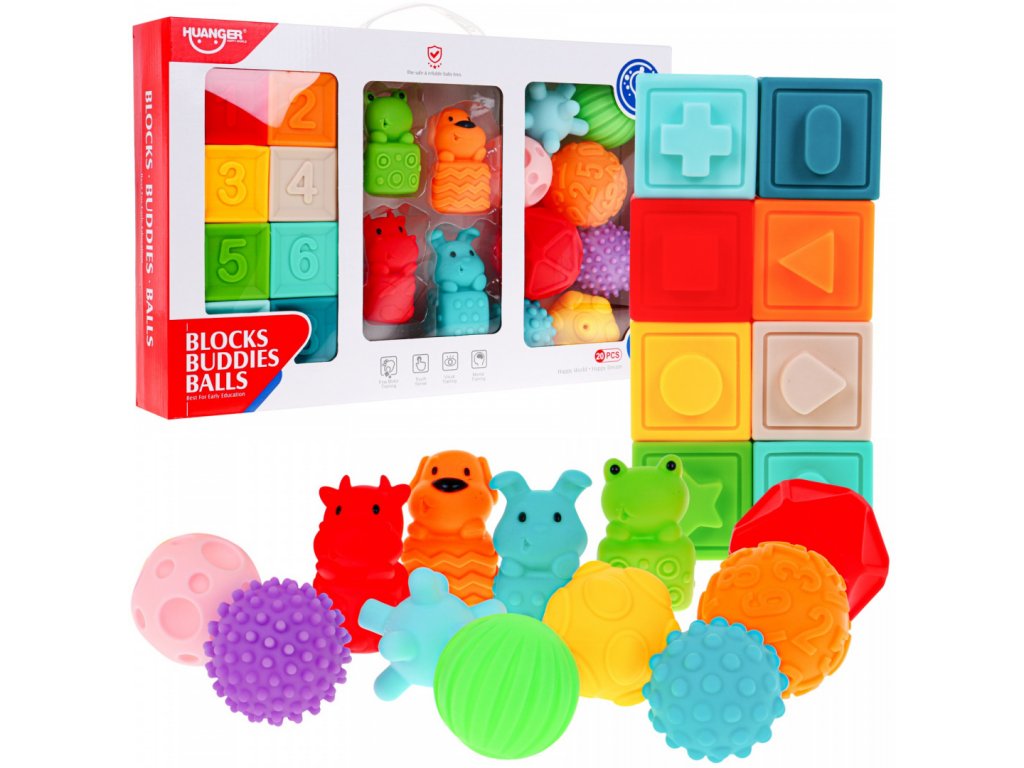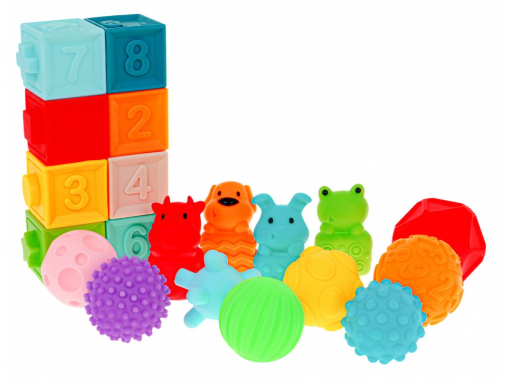 Érzékszervi gumijátékkészlet serkenti a gyerekek képzeletét, látását, hallását és tapintását. A készlet 20 darab gumijátékból áll, mindegyik más textúrájú és színű, különböző ingereket biztosítva a baba érzékszerveinek.