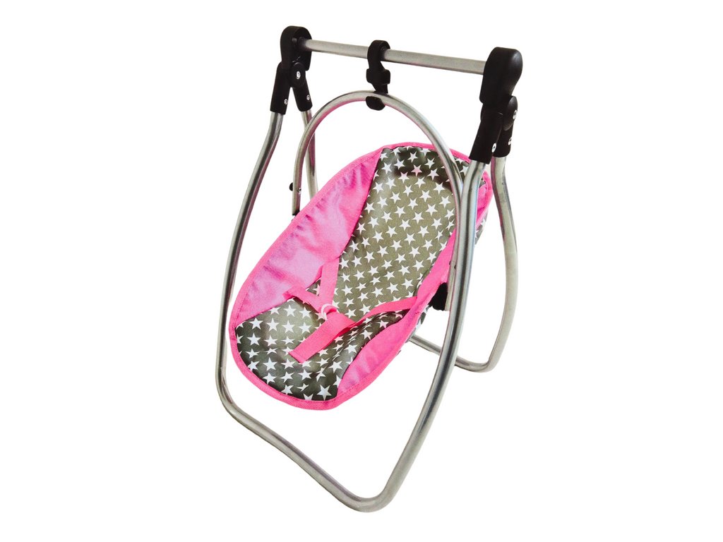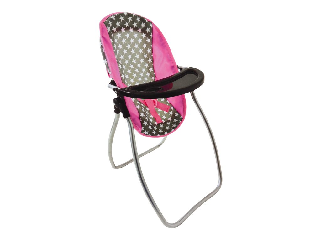 A szék stabil lábai alumíniumból készültek. A játék kétféleképpen használható hintaként és etetőszékként. A szürke, fehér csillagokkal díszített anyag oldalán rózsaszín csíkok találhatók. Az illesztések fekete műanyagból készülnek. Az olyan tulajdonságok, mint a gondoskodás és az odafigyelés, csak néhány a gyermeke által megszerzett tulajdonságok közül. Azt is megtanulják, hogyan kell gondoskodni egy kisgyermekről.