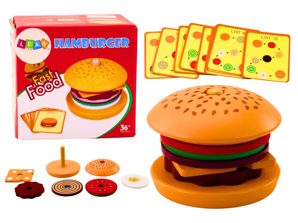 A fából készült hamburger 8 részből áll, és egy nagyszerű oktatójáték, amely szórakoztató és kreatív fejlődést kínál a gyerekeknek. A készlet különféle összetevőket tartalmaz, például zsemlét, szeleteket, sajtot vagy zöldségeket, amelyeket tetszés szerint kombinálva saját hamburgert készíthetsz. A csomagban 10 receptkártya is található, amelyeket követve fejleszthetik étkezési tervezési és elkészítési készségeiket a gyerekek. A játék ezzel a készlettel ösztönzi a koordinációt, a kreativitást és a színek és formák tanulását, a faelemek pedig hosszú élettartamot és biztonságot nyújtanak.
