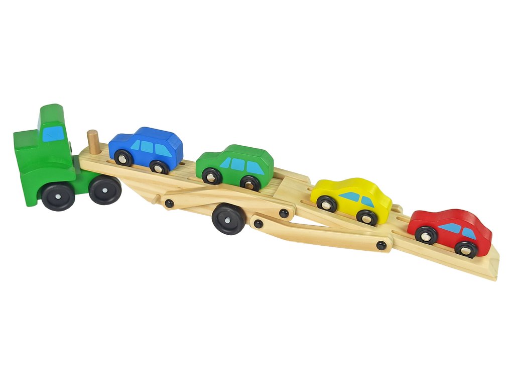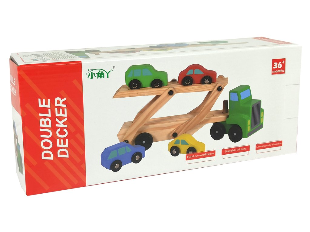 Kétszintes autószállító fából. A készlet tartalmaz egy teherautót, egy emeletes vontatót és 4 személyautót. Minden elem kiváló minőségű fából készült és ártalmatlan színnel van festve.