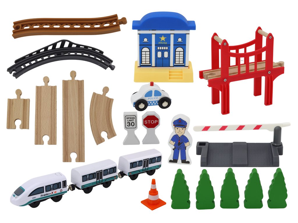 A készlet számos kiegészítőt is tartalmaz, amelyek valósághűséget és mélységet adnak a játéknak. A rendőrség, a rendőrautó, a rendőrfigura, a fák és az útjelző táblák lehetővé teszik a gyermekek számára, hogy különböző forgatókönyveket játszanak el, és különféle vasúti közlekedési történeteket alkossanak.