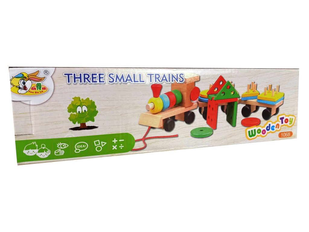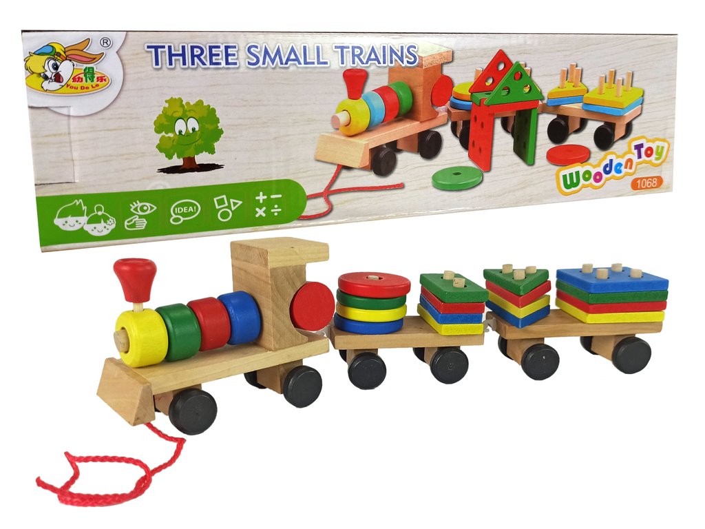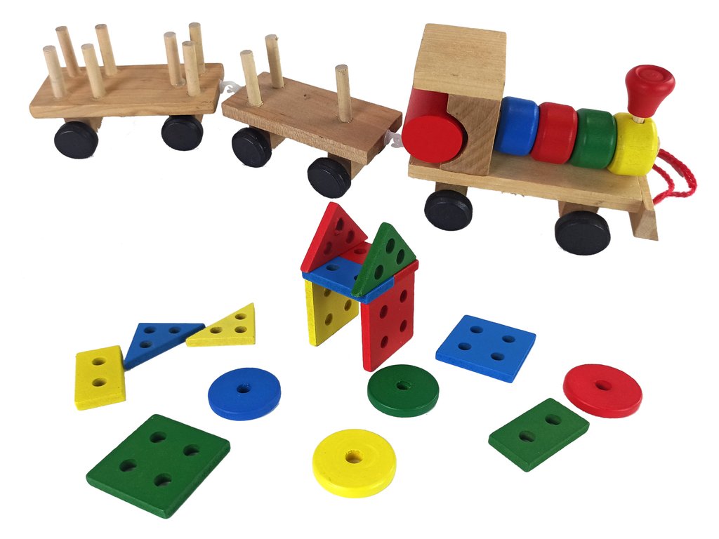 A két kocsis gyerekmozdony fából készült. A mozdony elöl zsinórral rendelkezik, így a gyerek maga mögé húzhatja a vonatot. A kocsik speciális horgokkal rögzíthetők a mozdonyhoz. A készlet különböző formájú és színű fakockákat tartalmaz. A gyermek ezeket a kockákat vagonokra helyezheti, vagy épületek építésére, formák rendezésére használhatja őket.