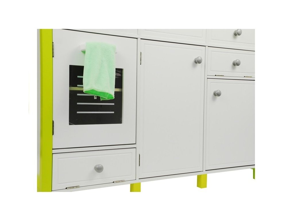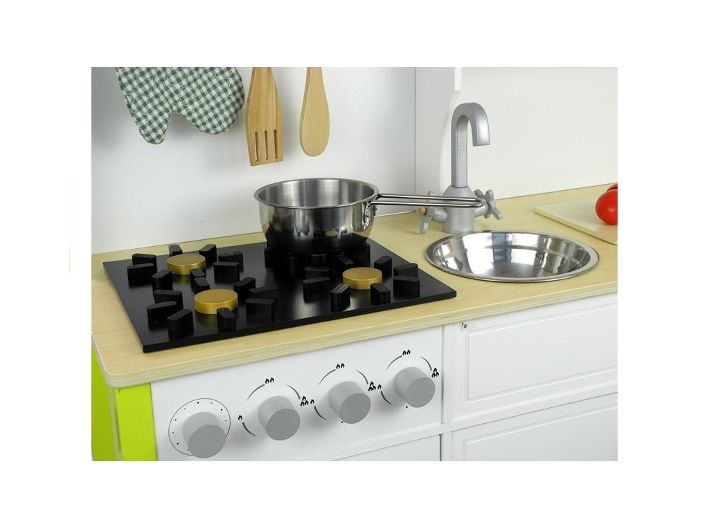 Fehér és zöld konyha , mely környezetbarát és tartós anyagból készült, ami fából készült. Használata a játék felépítésében jelentősen növeli nemcsak a játék tartósságát és megbízhatóságát, hanem a több éves használat kényelmét és biztonságát is. Ha ezt a játékot beépítjük a gyermek mindennapi játékába, az pozitívan befolyásolja képzeletének fejlődését, függetlenségét és a konyhai eszközökkel való biztonságos játék képességét. A gyermek megismeri és megtanulja az alapvető házimunkát. Játék 3 éves kortól gyermekek számára.
