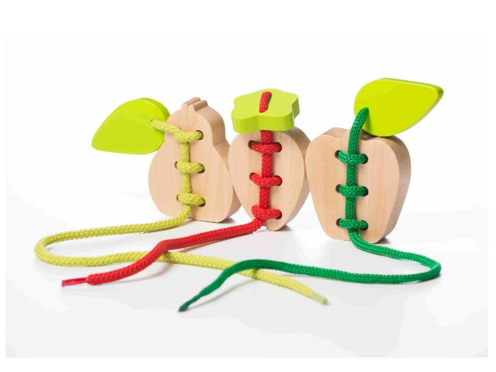 A készlet háromféle gyümölcsből áll, melyeket a gyerek madzaggal köt össze, azaz 9 részből, és 3 színes csipkéből, amivel az egyes elemeket össze tudja kötni.