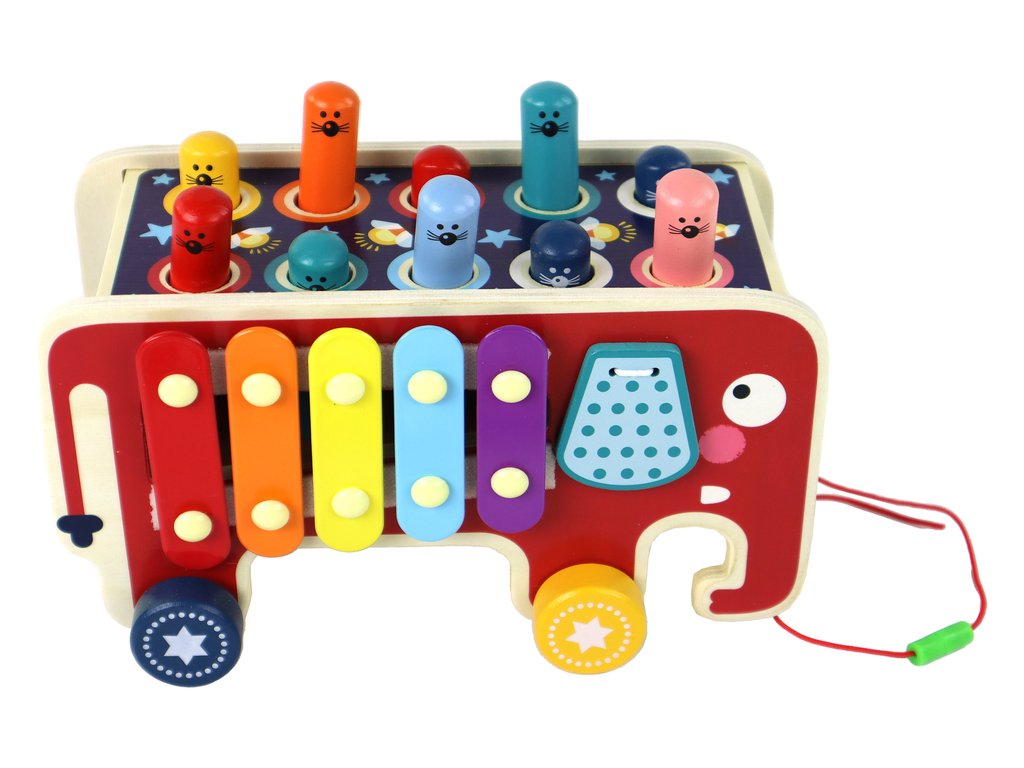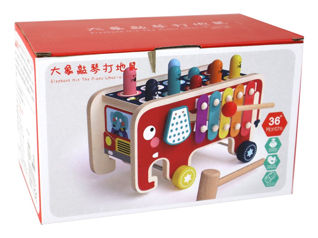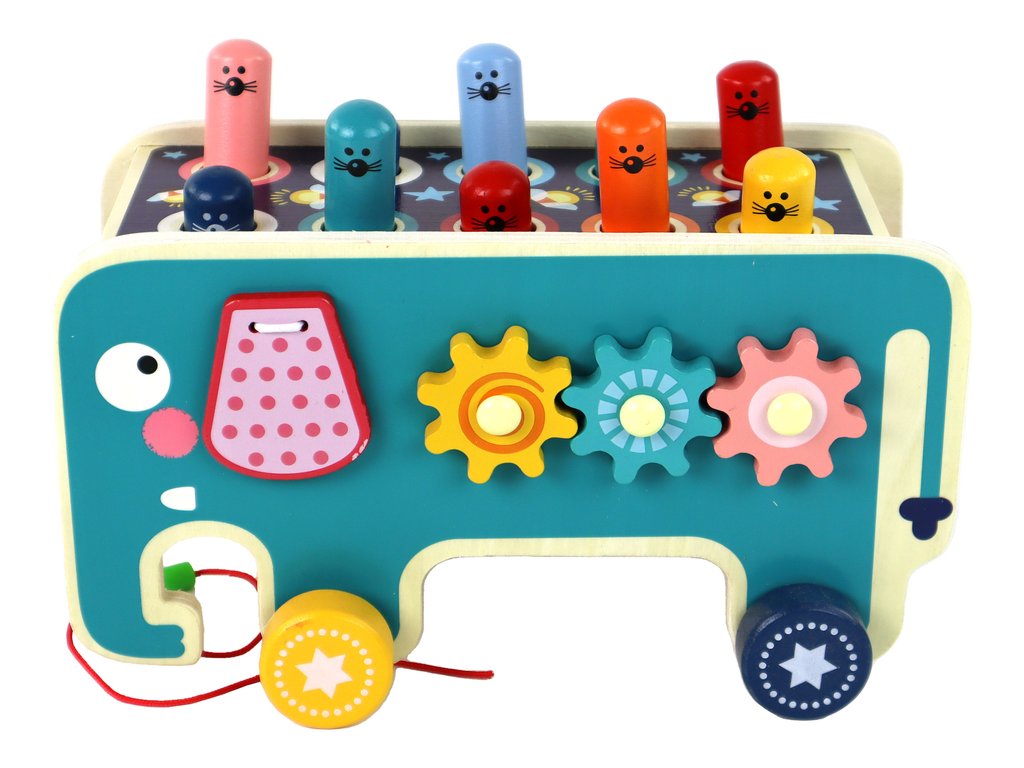 A készlet egy elefánt motívumú faautóból áll, mely felkelti a kicsik figyelmét. Az autó tetején földalatti állatok színes fejei vannak, amelyek a „Whac-a-Mole” játék célpontjává válnak. A gyerekek a mellékelt kalapáccsal próbálják megtörni őket, fejlesztve ezzel kézügyességüket és mozgáskoordinációjukat.