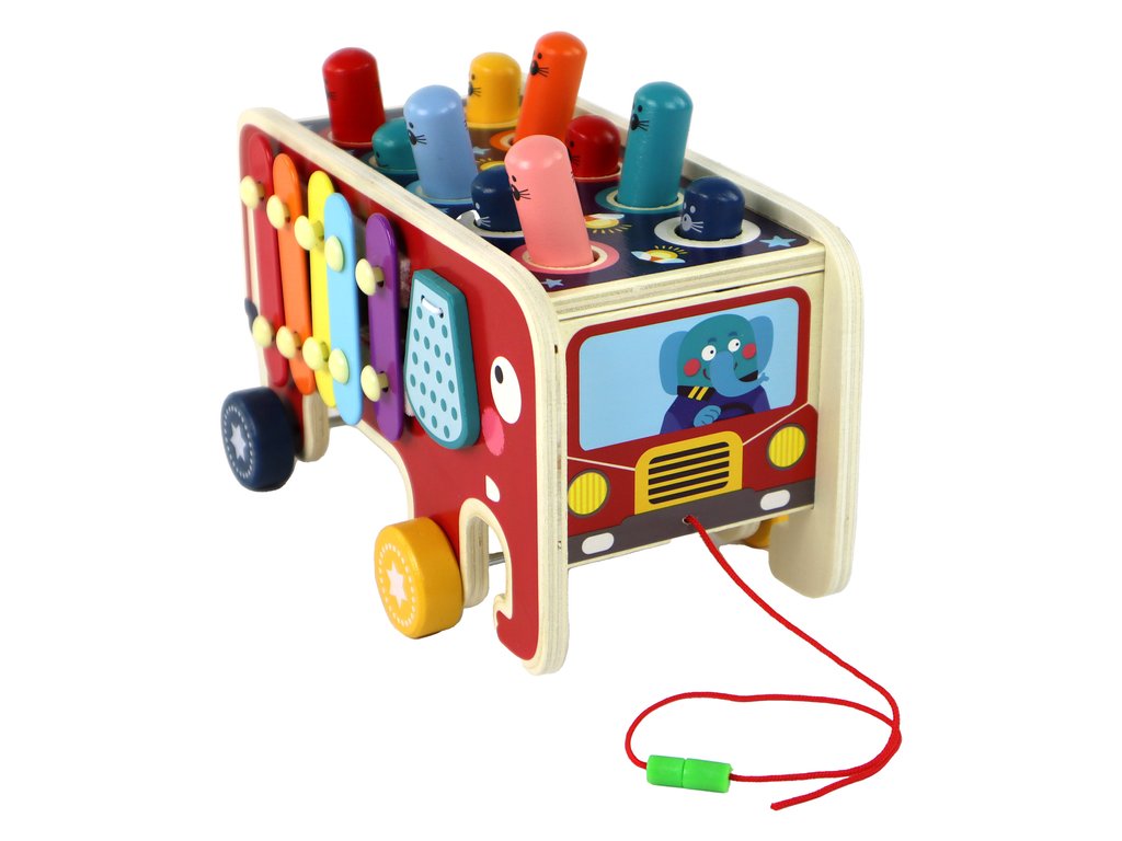 A készlet teljes, és tartalmaz egy húzózsinóros autót, 2 db "Whac-a-Mole" játékkalapácsot és egy cintányért. Ezenkívül a játék biztonságos fából készült, amely garantálja a gyermekek tartósságát és biztonságát.