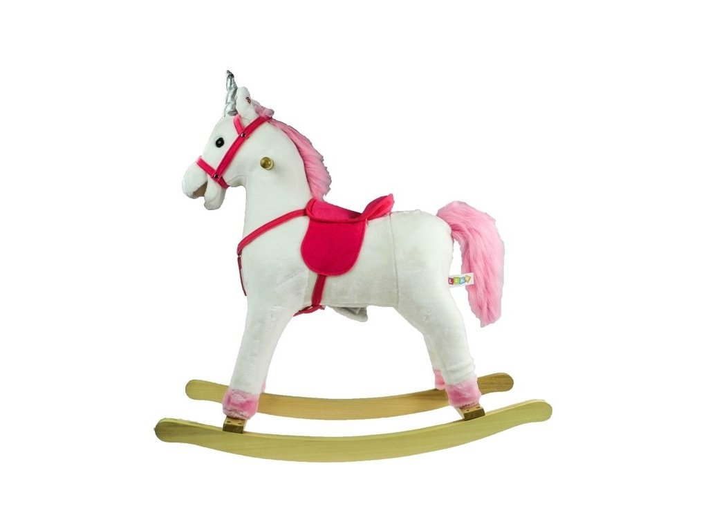 A hintaló puha plüssből készült, fa fogantyúval és fa talppal rendelkezik. Vágtató és morgó hangokat ad ki. Nagyszerű játék minden kis hercegnőnek. Fehér színe van, amit gyönyörű rózsaszín elemekkel egészítenek ki, mint a farok, a sörény és a nyereg.