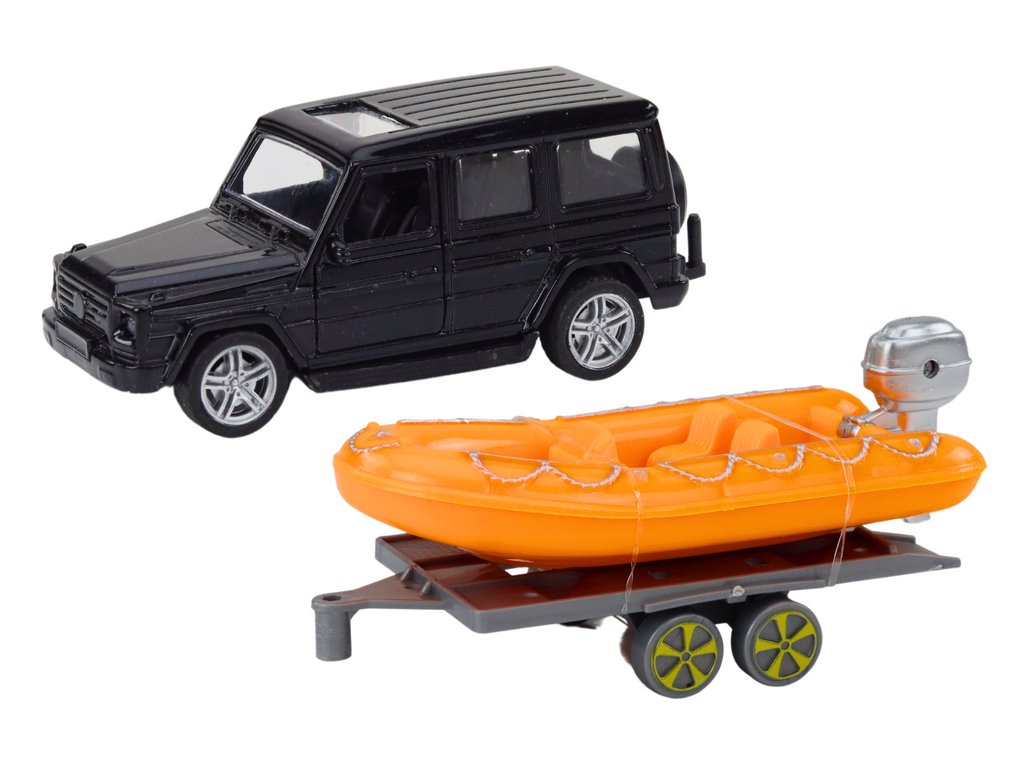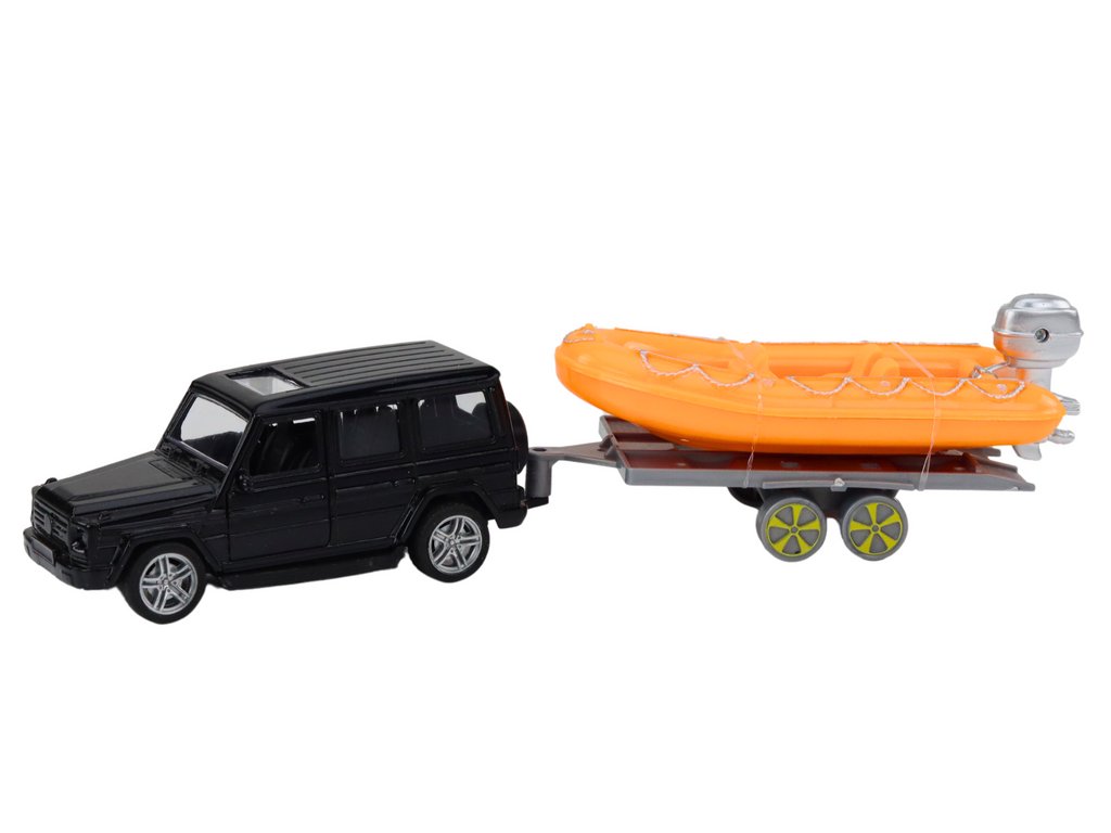 Bemutatjuk legújabb termékünket, amely minden kis kalandort biztosan megörvendeztet – egy fekete autót csónak utánfutóval és egy narancssárga csónakot!