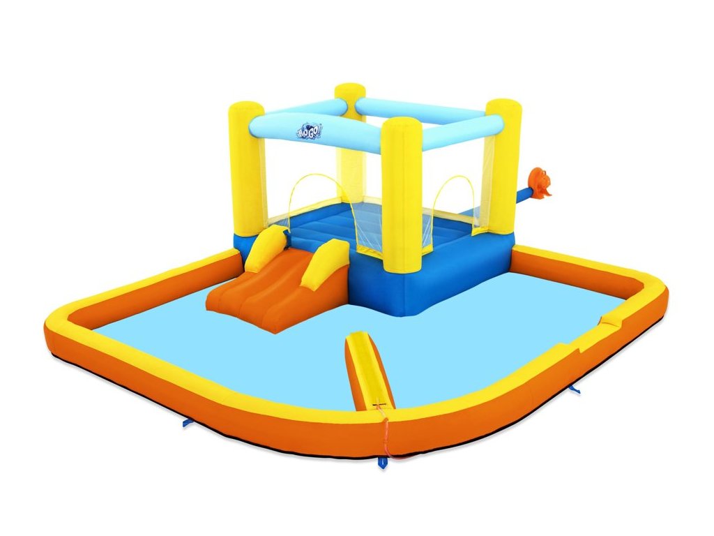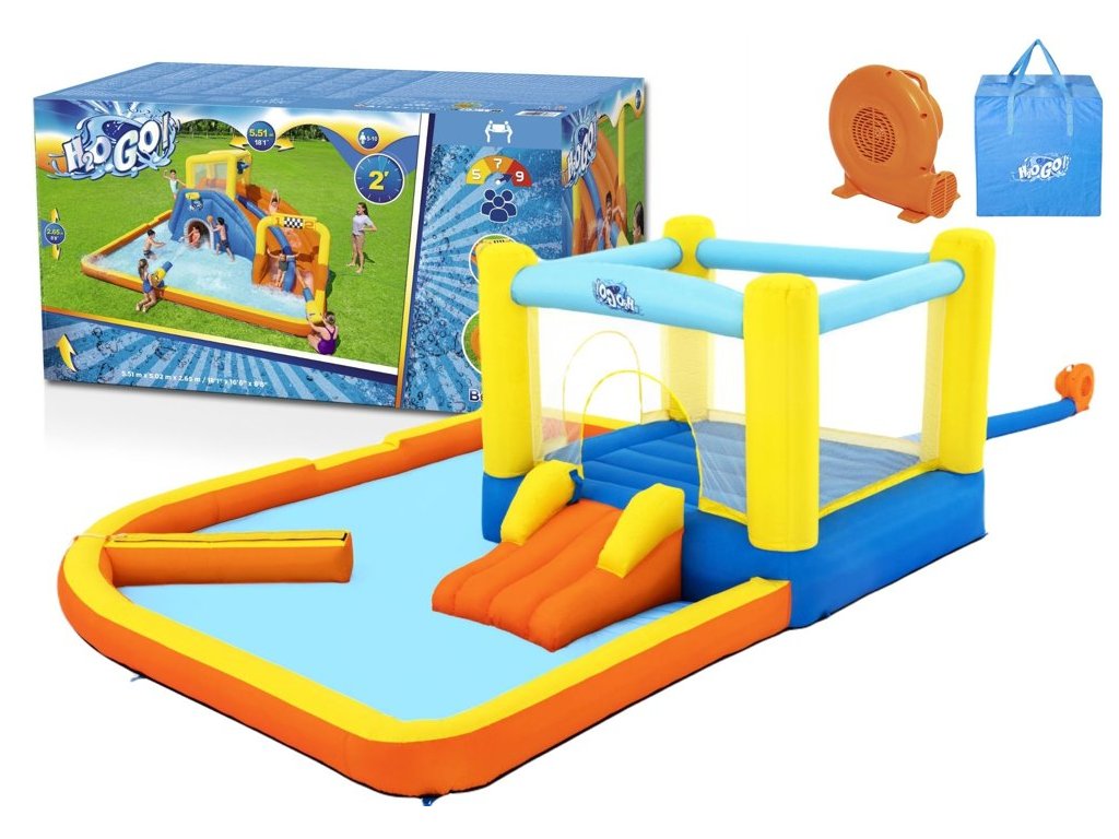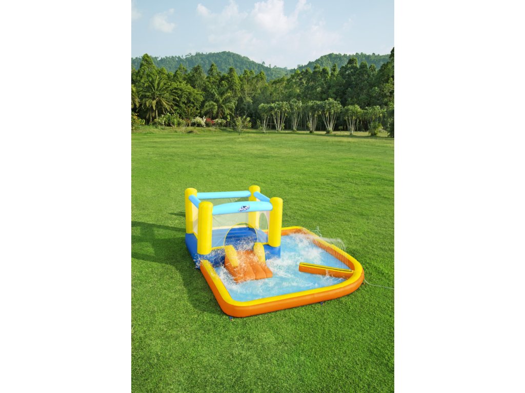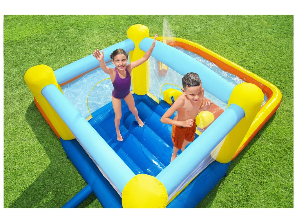 A színes Bestway felfújható vízi játszótér ugrófelülettel, csúszdával és vízfüggönnyel van felszerelve. A fúvó 2 perc alatt feltölti levegővel.