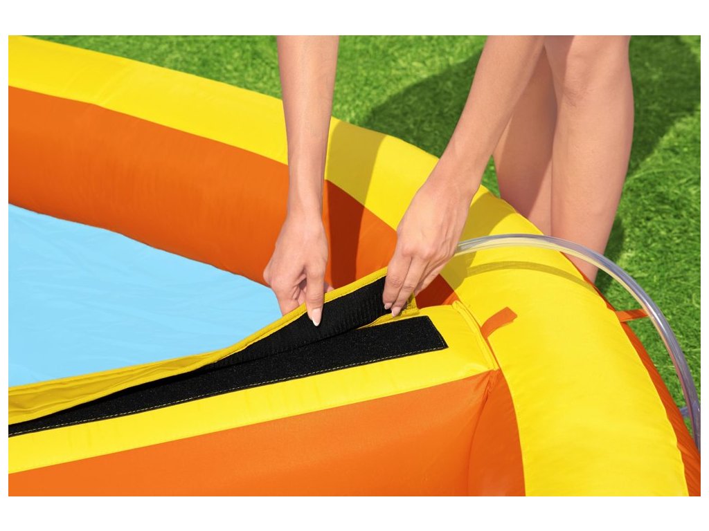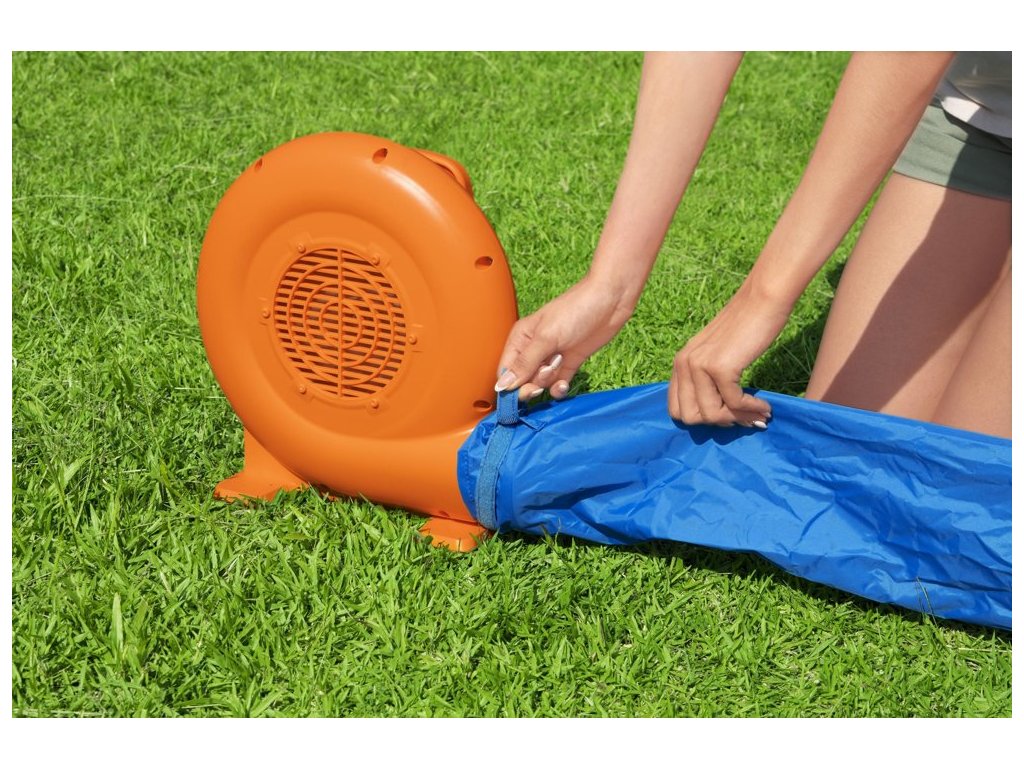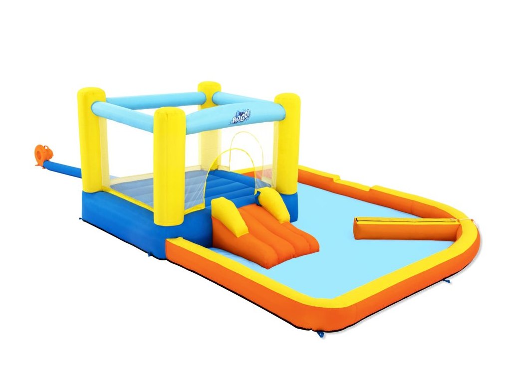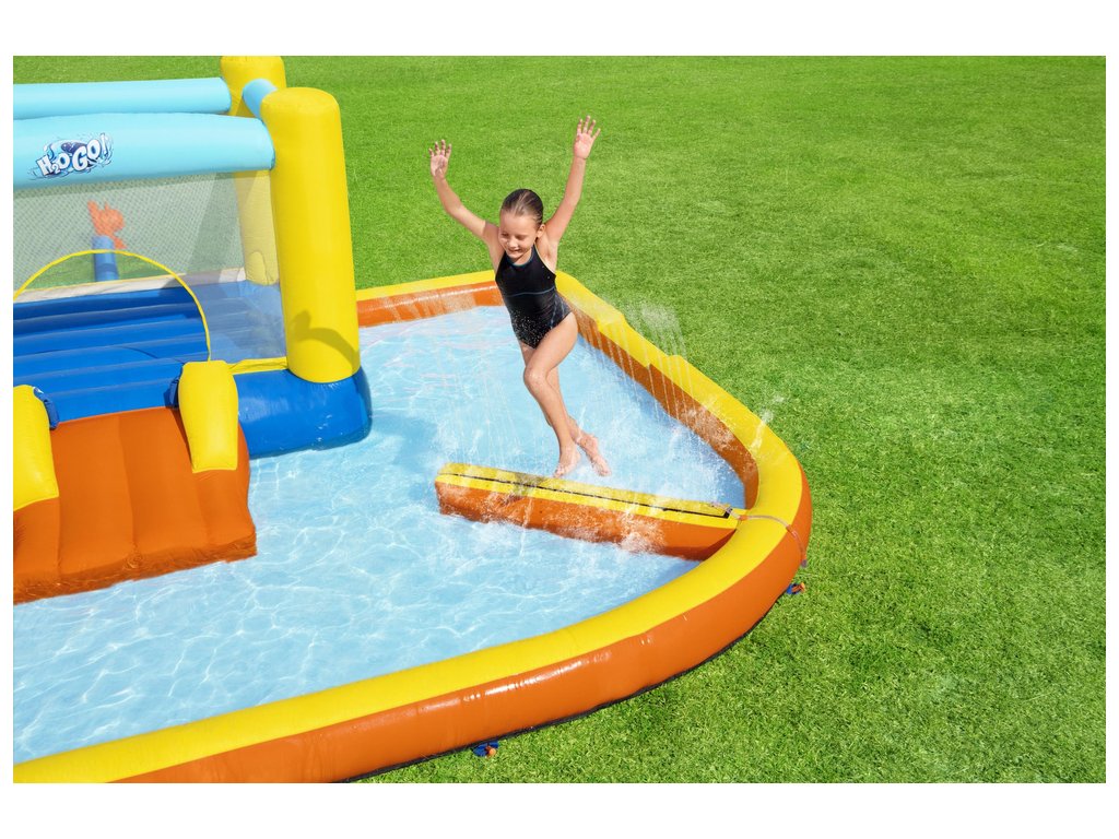 A színes Bestway felfújható vízi játszótér ugrófelülettel, csúszdával és vízfüggönnyel van felszerelve. A fúvó 2 perc alatt feltölti levegővel.