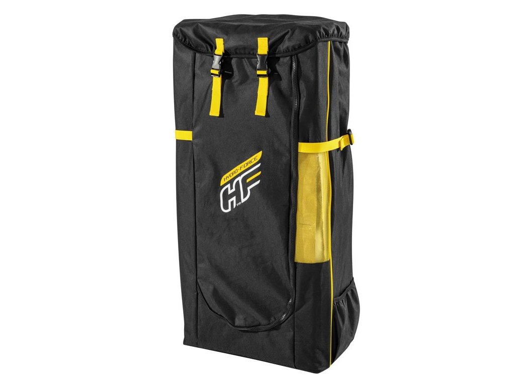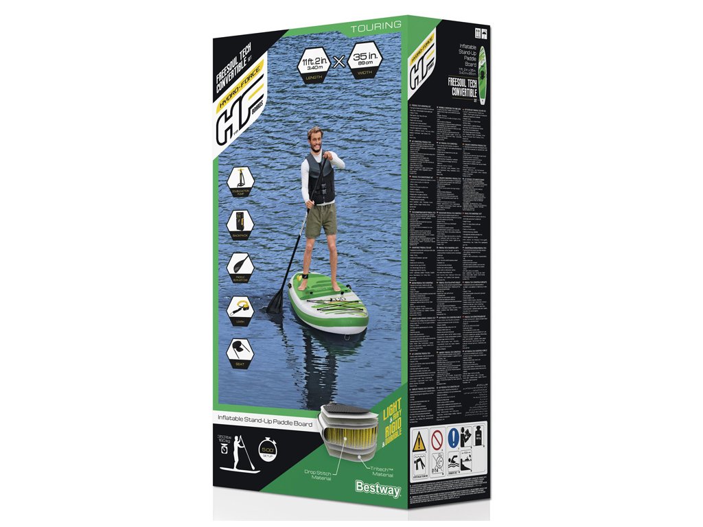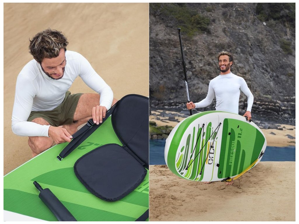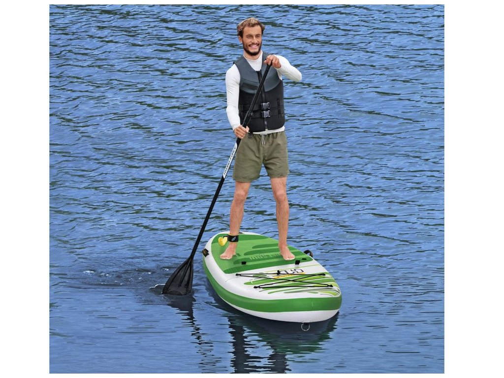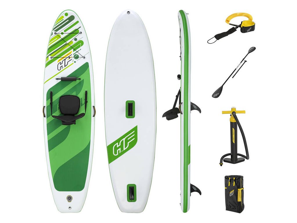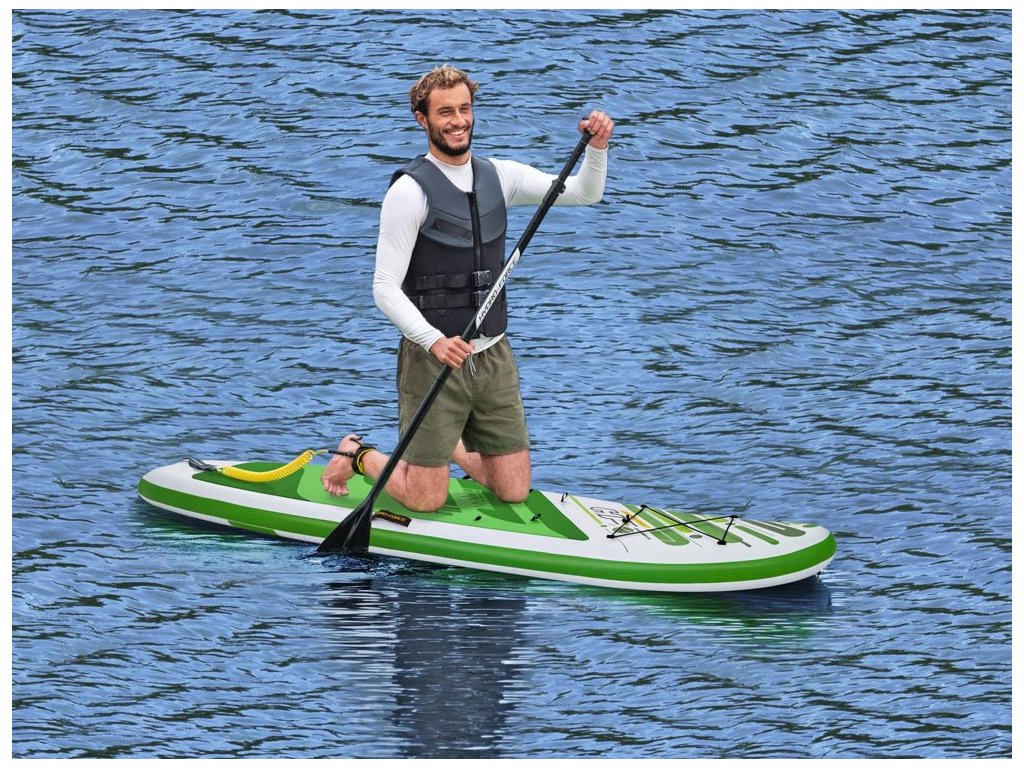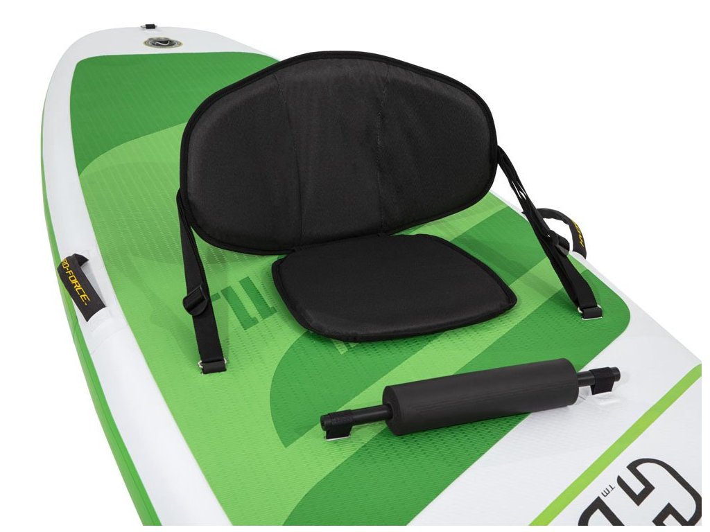 A Bestway paddleboard kényelmes üléssel rendelkezik, háttámlával. A készlet tartalmaz egy robusztus lapátot, kézi pumpát, pórázt, hátizsákot, uszonyt és javítókészletet is.