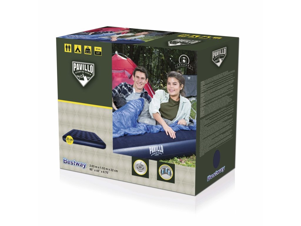 A kétszemélyes turistamatrac beltéri és kültéri használatra készült. Tartós PVC anyagból készült, így ellenáll a sérüléseknek. A matrac felső részét puha velúr borítja. A matrac alkalmazkodik a test formájához, és tökéletesen illeszkedik a sátor alá vagy otthon a vendégek pótágyaként. Ha vízi vagy tengerparti kiránduláshoz matracra van szüksége, gond nélkül használhatja. A matrac felfújása nem sok időt vesz igénybe, és a pihenés végeztével ugyanolyan könnyű leengedni és szállítani. A modern Coil-Beam technológiának köszönhetően a matrac stabil és kényelmes.