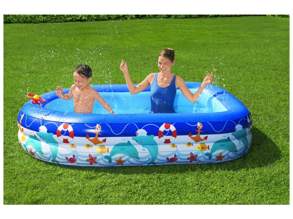 A felfújható csónak medence tetővel 213 x 155 x 132 cm méretű. Nagy, megbízható medence az egész család számára , ahol a gyerekek szabadon úszhatnak. A medence világos, így könnyen átviheti oda, ahol az adott napszakban a legmelegebb. Két felfújható gyűrűvel rendelkezik, és ideális a nyári pihenéshez.