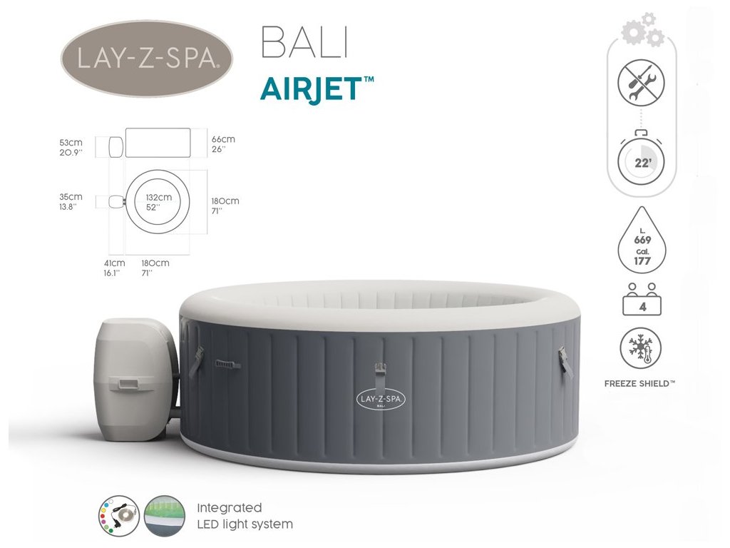 A Lay-Z-Spa® Bali AirJet™ Bestway egy kényelmes , felfújható pezsgőfürdő, amelyet az otthoni boldog pihenéshez terveztek.