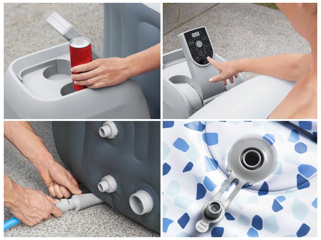 - Digitális pezsgőfürdő vezérlőpanel és szivattyú integrált szűrőrendszerrel, pohártartókkal és a pezsgőfürdő belsejéből érhető el