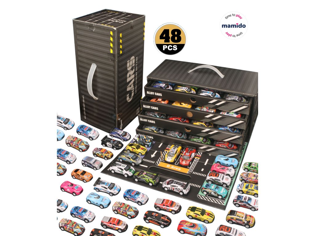 Hatalmas 48 fém kisautó gyűjteménye egy praktikus dobozban örömet szerez minden kis sebességrajongónak. Az autókat egy masszív, konténer alakú bőröndben tárolják, amely kihúzható rekeszekkel rendelkezik a teljes gyűjtemény áttekinthető elrendezéséhez. A fogantyúnak köszönhetően a bőrönd könnyen szállítható, és a gyerekek bárhová magukkal vihetik az autókat.