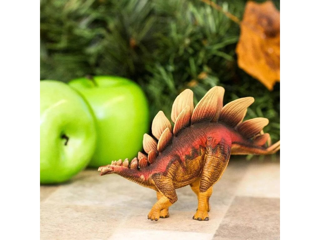 A jól ismert növényevő dinoszaurusz reprezentatív modellje élénk színekkel, jellegzetes lapos lemezekkel a hátán és hosszú, tüskés farokkal. A precíz formázás megragadja a Stegosaurus tipikus jellemzőit.