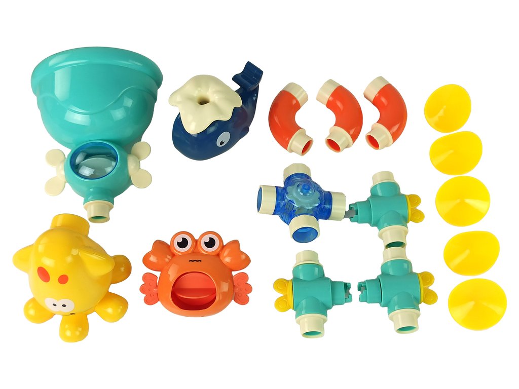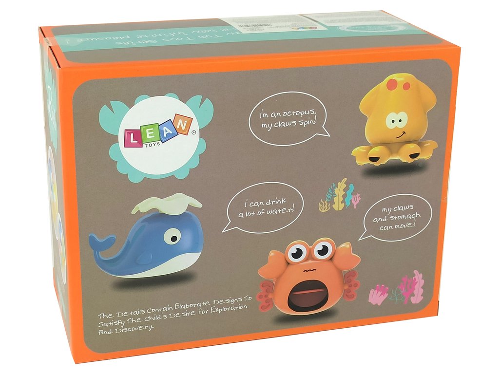 Három bájos tengeri lényt tartalmaz: egy sötétkék bálnát, egy vörös rákot és egy sárga polipot. Hogyan biztosítanak szórakozást? Könnyű! Ha vizet önt a felső kék edénybe, a gyermek figyelheti, ahogy a víz átfolyik a játék különböző részein.