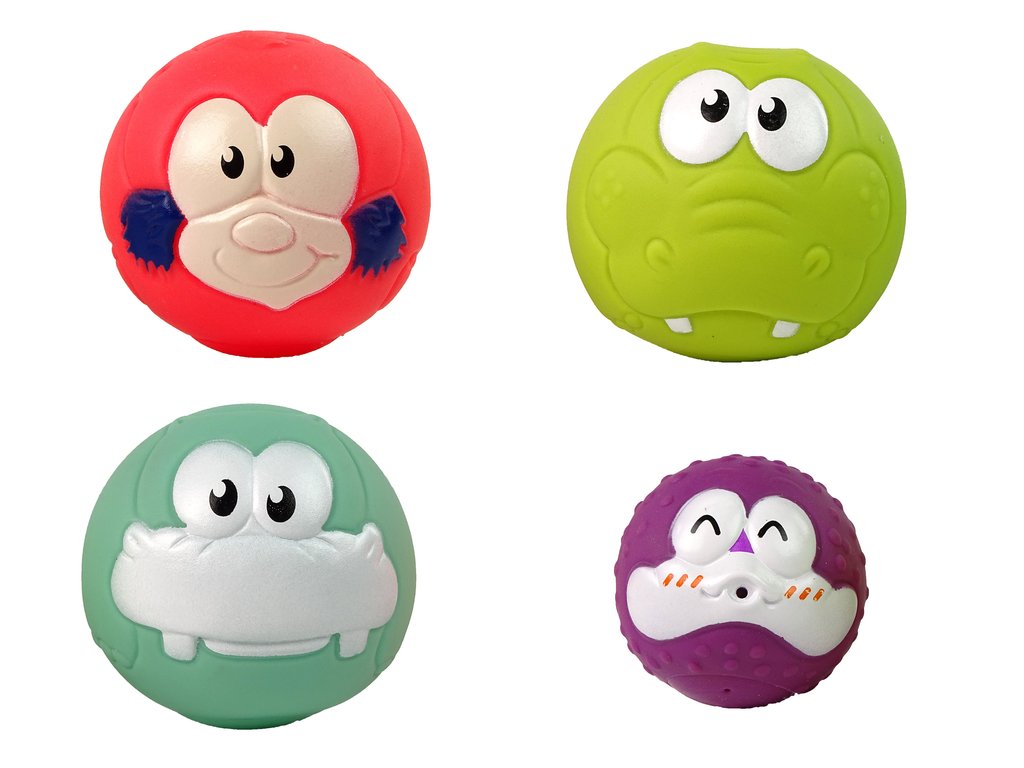 A négy golyón kis lyukak vannak, amelyekbe víz folyik, a játék megnyomása után a víz viccesen kifröccsen, ami biztosan el fogja szórakoztatni gyermekét. A golyók kis állatok alakúak: krokodil, víziló, hal, majom.