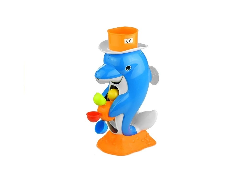 A delfin fehér részletekkel, sapkával és szélkerékkel van díszítve. A játék stabilitást garantáló alapra van helyezve. Hátul tapadókorong található, így a játék fürdőszoba csempére is rögzíthető.