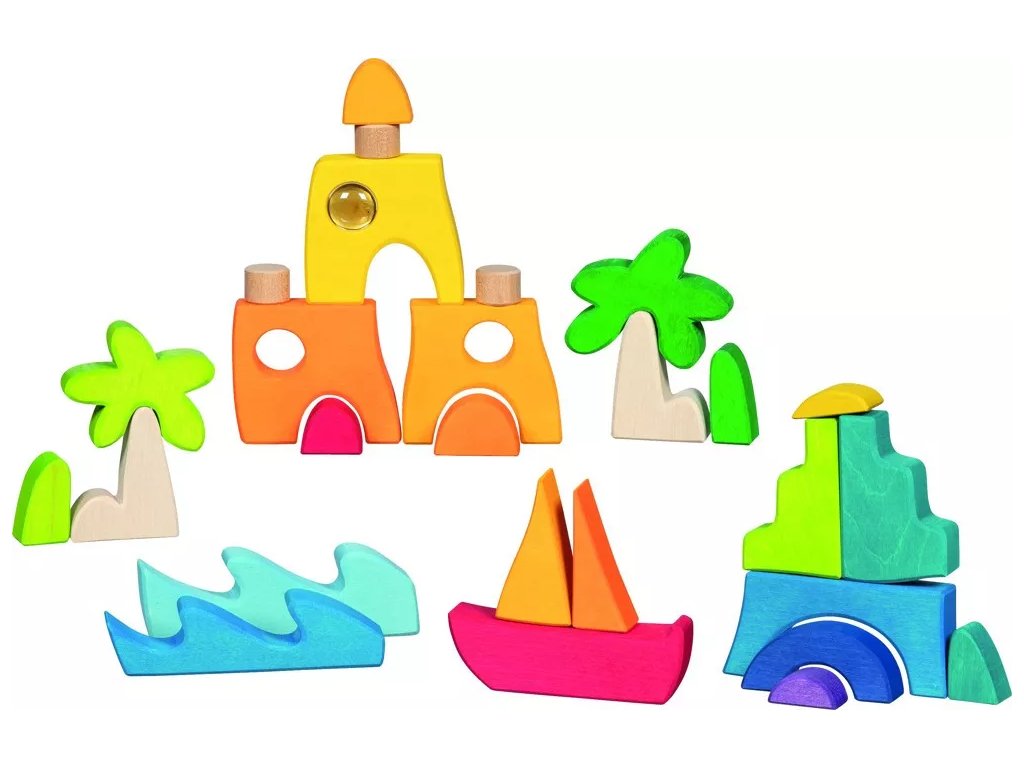 A puzzle különleges formákat tartalmaz, amelyek házakat, hullámokat és pálmafákat ábrázolnak, amelyek szabadon rakosgathatók a fa keretben. A készlet három csillogó követ is tartalmaz, amelyek kiegészítik a mű végső formáját. Az egyes darabok más építőkészletekkel kombinálhatók, így nagyobb kompozíciók hozhatók létre.