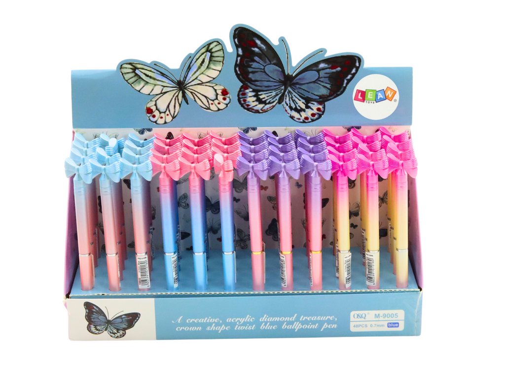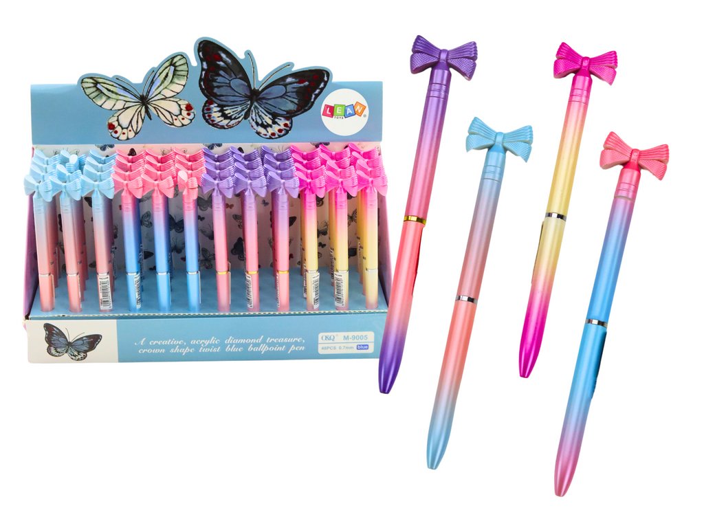 Ez az egyedülálló toll ötvözi az eleganciát és a funkcionalitást. A végén masni található, amely kifinomult megjelenést kölcsönöz neki. A kék tinta ideális társ a mindennapi használatra és különleges alkalmakra is. Kiváló választás azok számára, akik bájt és eleganciát szeretnének varázsolni jegyzeteikbe vagy levelezésükbe.