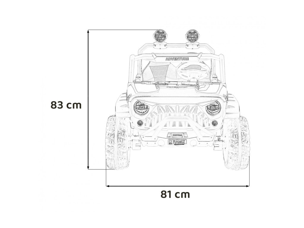 A robusztus PASSION 4x4 összkerékhajtású gyermek terepjáró nagy teljesítményt, magas fokú kényelmet és vonzó dizájnt kínál. Négy, egyenként 200 W teljesítményű motorja, a nagy EVA habszivacs kerekekkel és az állítható hátsó lengéscsillapítókkal együtt még a legnehezebb terepen is képes vezetni. Az öko-bőrrel bevont kétszemélyes ülés , a biztonsági övek és a LED-világítás realisztikus megjelenést és biztonságot kölcsönöz az autónak.