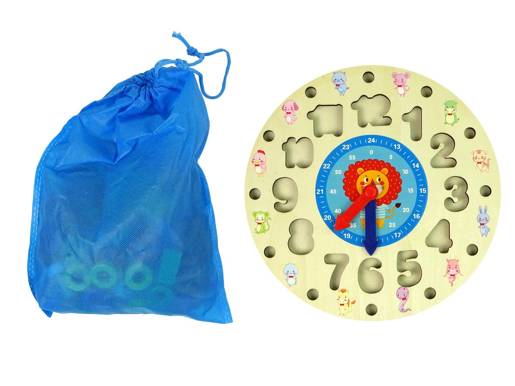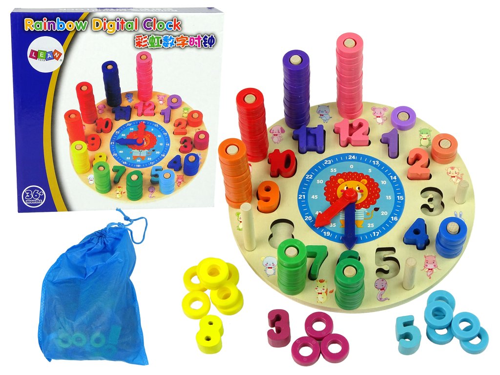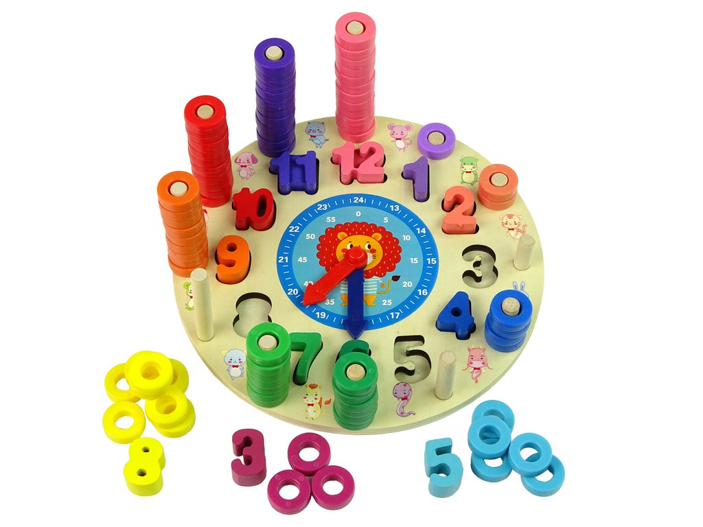 Oktató jellegű faóra számbetéttel és tekercsgyűrűkkel. A játék kiváló minőségű fából készült, minden eleme gondosan csiszolt és lakkozott.