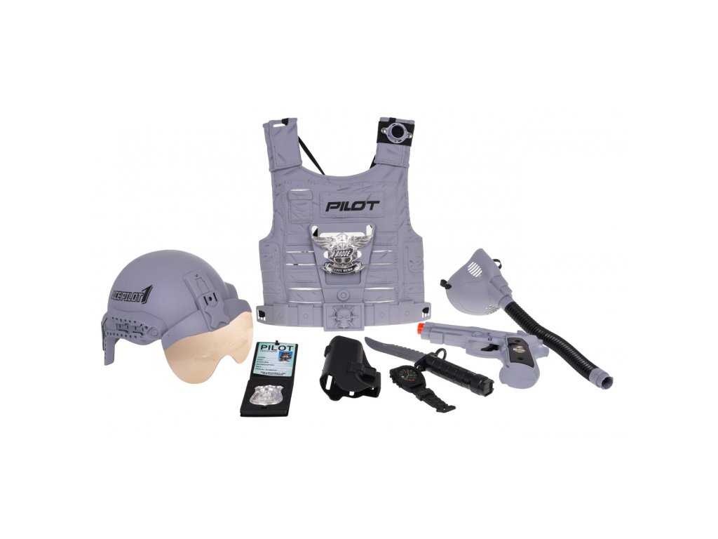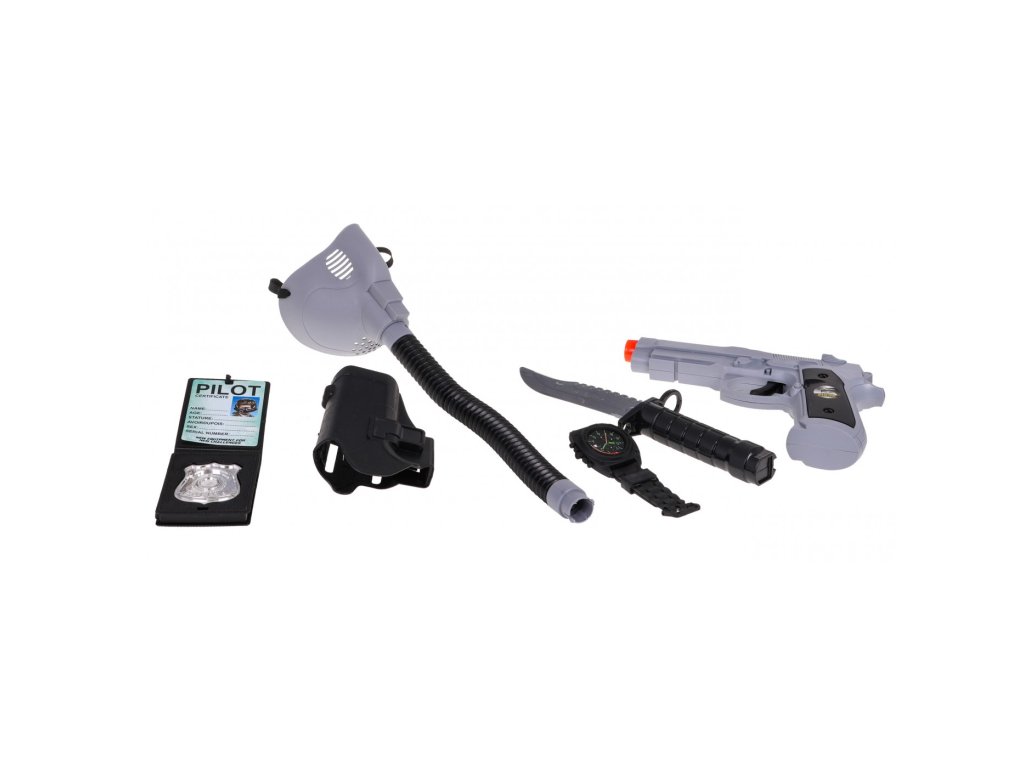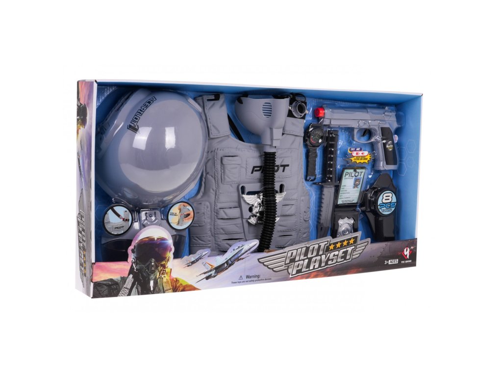 A kis pilótakészlet 3 éves kortól gyermekek számára készült. A készlet lehetővé teszi, hogy utánozza egy igazi pilóta játékát. Tartalmazza a sisakot, mellényt, oxigénmaszkot, pisztolyt, tokot, pilótaengedélyt, órát és kést. A sisak műanyag lencsés szemüveggel és állítható pánttal van felszerelve. A pilótamellény gumiszalaggal rögzíthető. A pisztoly 3 x AG13 elemmel működik (az elemeket tartalmazza), és tüzelési hangot ad ki. Az egész készlet a részletekre való odafigyeléssel készült, és teljesen biztonságos a gyermek számára.
