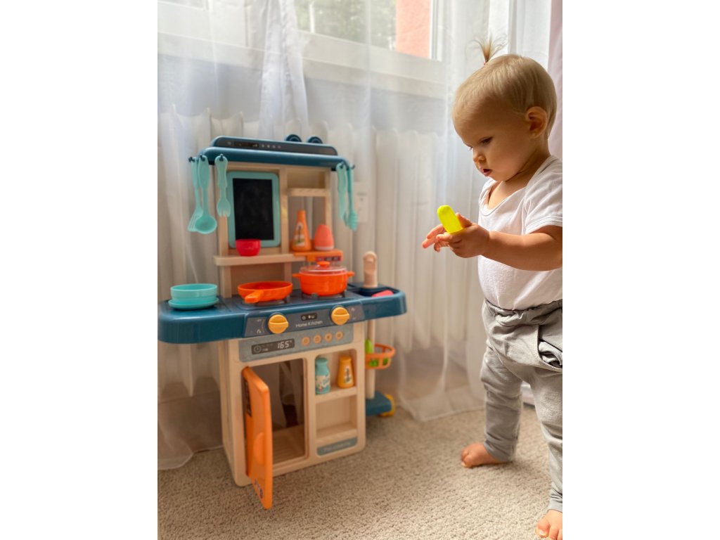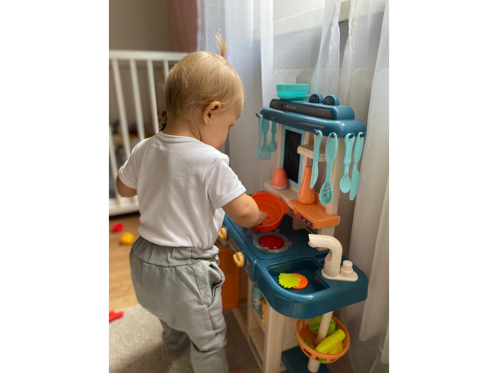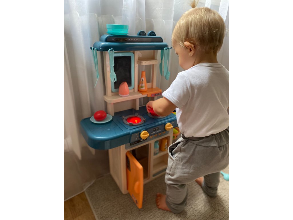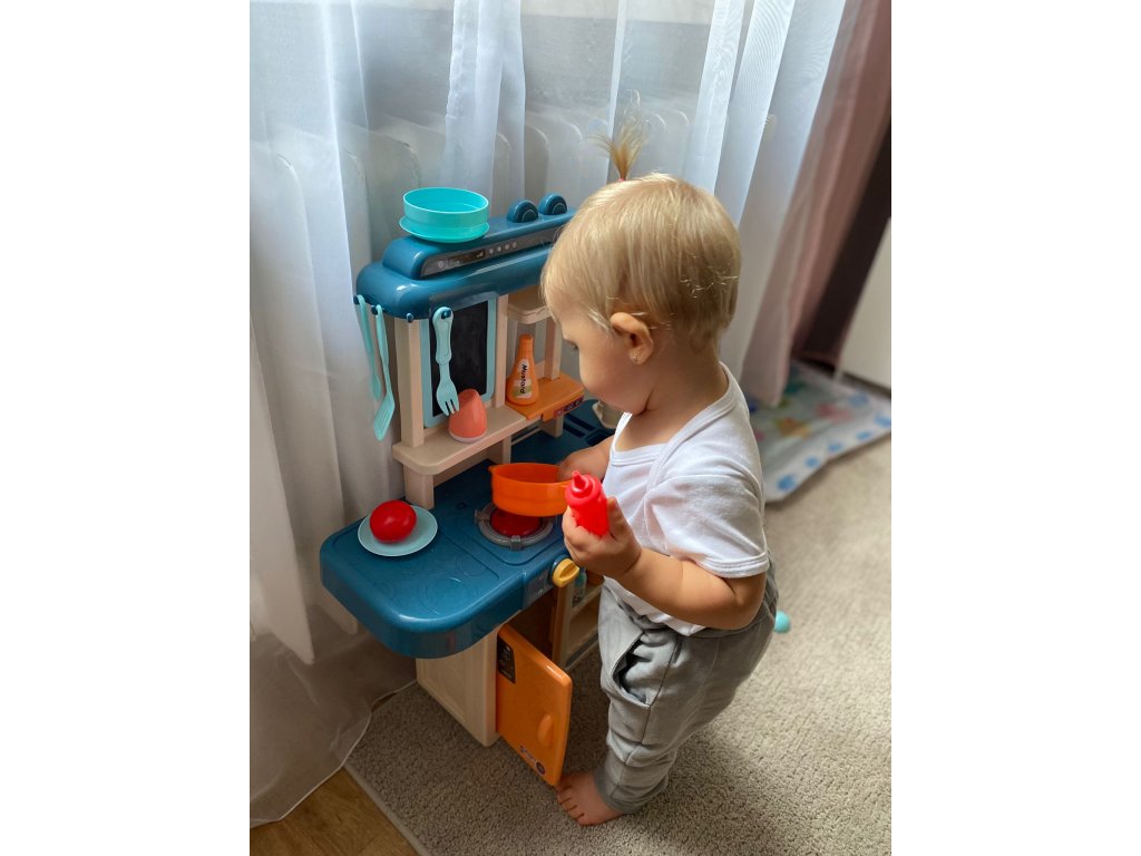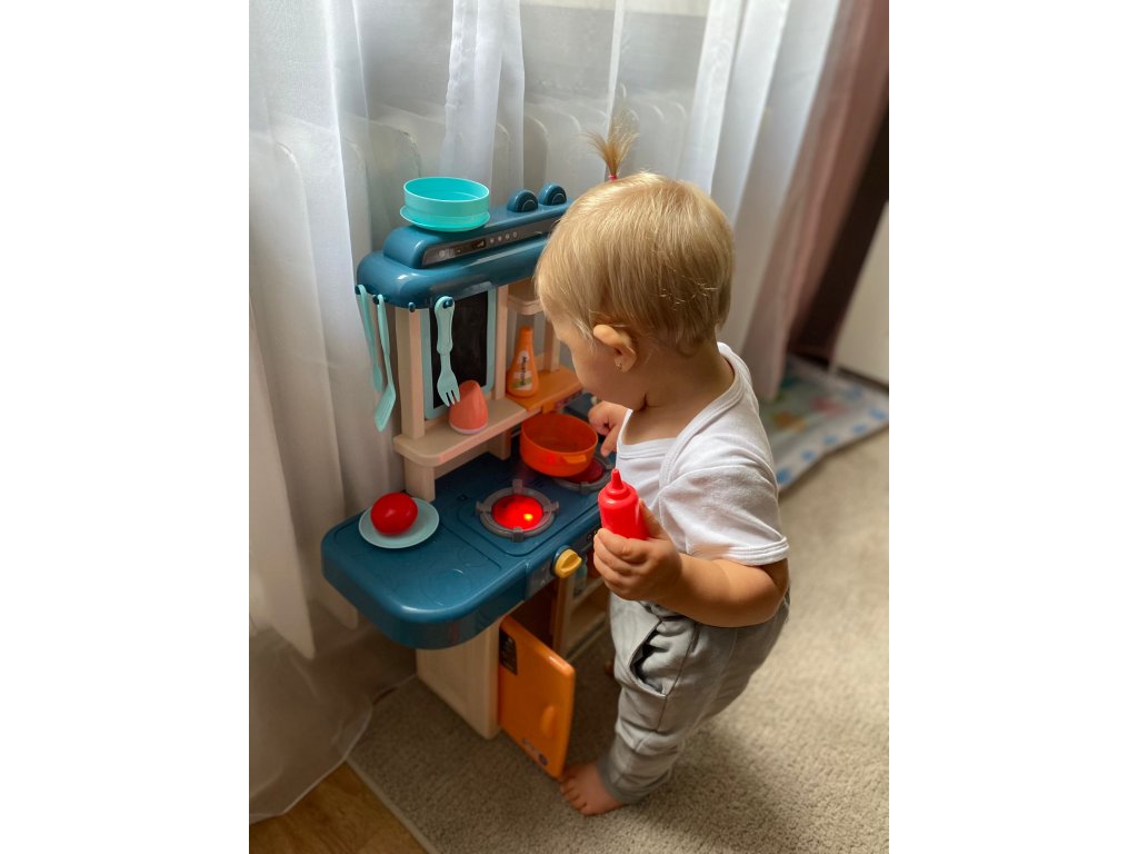 Gyerek konyhai készlet 42 elemből. A konyhában van egy mosogató vízelvezető csappal, két indukciós égő , mozgatható gombok, nyitható hűtőszekrény , polcok és sok egyéb konyhai kiegészítő. A tűzhely égőinek bekapcsolása után főzési hangok hallhatók, amit villogó piros fény kísér. Érdekes kiegészítés egy leíró tábla , amelyre bevásárlólistákat vagy recepteket írhat.