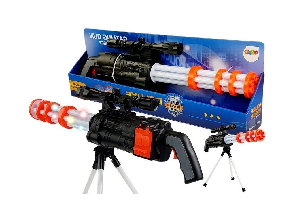 Egy háromlábú gyermekpuska biztosan minden gyereket órákon át szórakoztat. A puskát professzionális lövöldözős irányzékkal és speciális állvánnyal szállítjuk. A gyerekpisztoly hang- és fényeffektusokkal is rendelkezik, amelyek a ravasz meghúzásakor aktiválódnak.