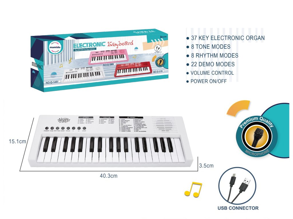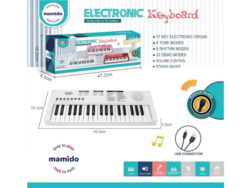 Fedezd fel a zene világát ezzel a 40 cm hosszú gyermek billentyűzetes hangszerrel, amely kiváló választás a kis kezdő zenészek számára. A billentyűzetnek 37 billentyűje, 8 hangnem módja, 8 ritmusa és 22 demó dala van, amelyek segítik a zenei hallás és a kreativitás fejlesztését. A vezérlés egyszerű a panelen található piros gombokkal, ahol a gyerekek beállíthatják a hangot, a hangerőt, elindíthatják a kíséretet, vagy kipróbálhatnak különböző zenei stílusokat. Az áramellátás a mellékelt USB-kábelen keresztül történik, így nincs szükség további elemek vásárlására.