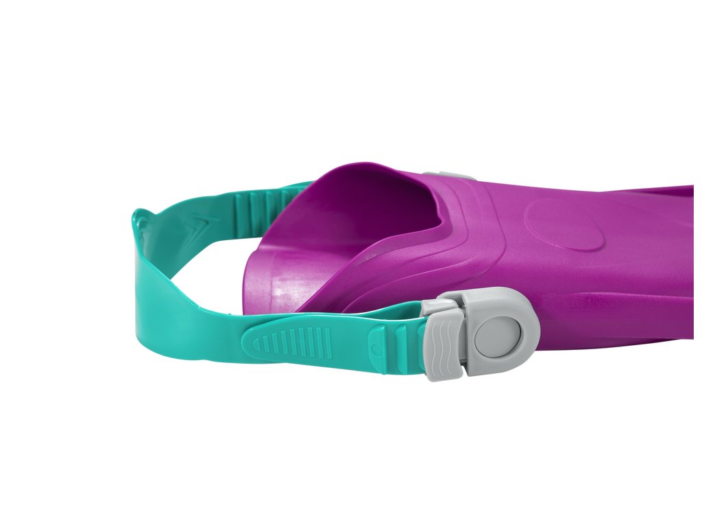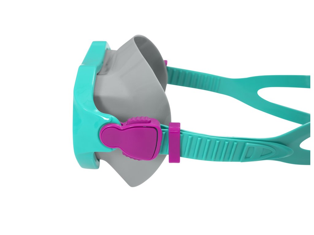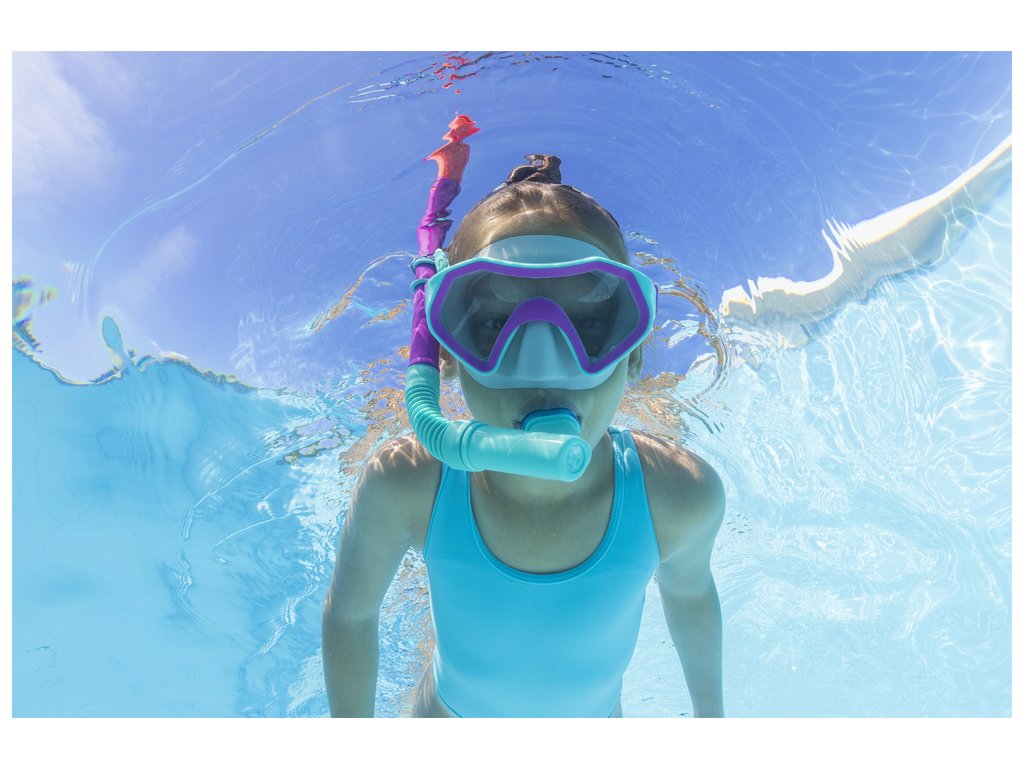 Szemüveg készült UV védő lencsék . A szemüveg körül is puha fényudvar található, és kényelmesen illeszkedik a gyermek arca köré, megakadályozva, hogy víz kerüljön a szemüvegbe. Az is elérhető állítható pánt a fejen, amit gyermeke fejéhez igazíthat. A víz alatti kalandok során is stabilitást biztosít. puha uszonyok, amelyek nem csúsznak le a lábáról, és mérethez igazodnak 37-41 . A légzőcső olyan technológiával van felszerelve, amely megakadályozza a víz bejutását.