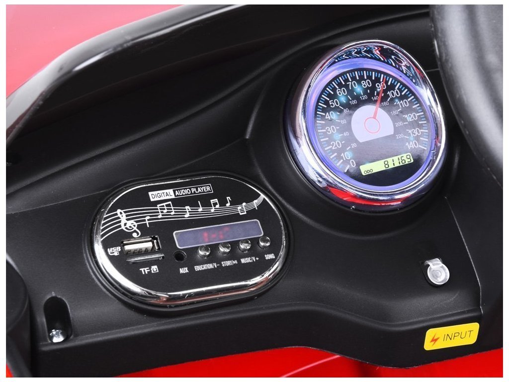 Menet közben a játékautó világít, a kormányon van egy gomb kürt hangokkal és különféle dallamokkal . Saját MP3 lejátszót is csatlakoztathat az autóba, így gyermeke hallgathatja kedvenc dalait, meséit stb.